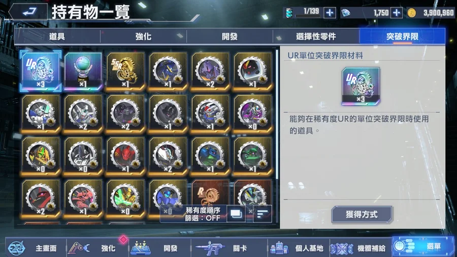 如圖,多UR限定高突破,還有3個UR突破機體齒輪+1個UR突破支援人員