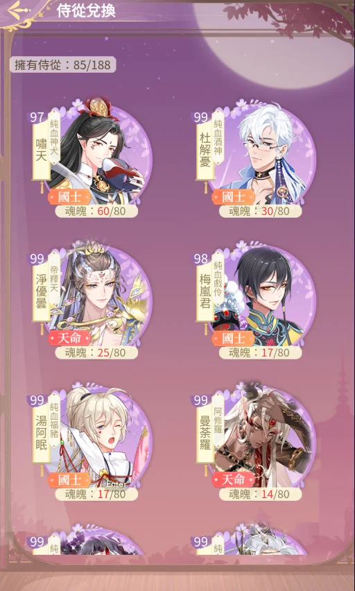 血統無 高麗 藥靈 天照 埃及 維京 祥雲 波斯 魔羅 華爾琪 奶茶 阿修羅 晝夜 饕餮 檮杌 夢饃 噫嗚 霜花狼 冰晶羊 浮游 流螢 人文 理工 離火 琉璃 雷師 以上血統都沒有其他都有有底線的是有侍從但還沒生小孩