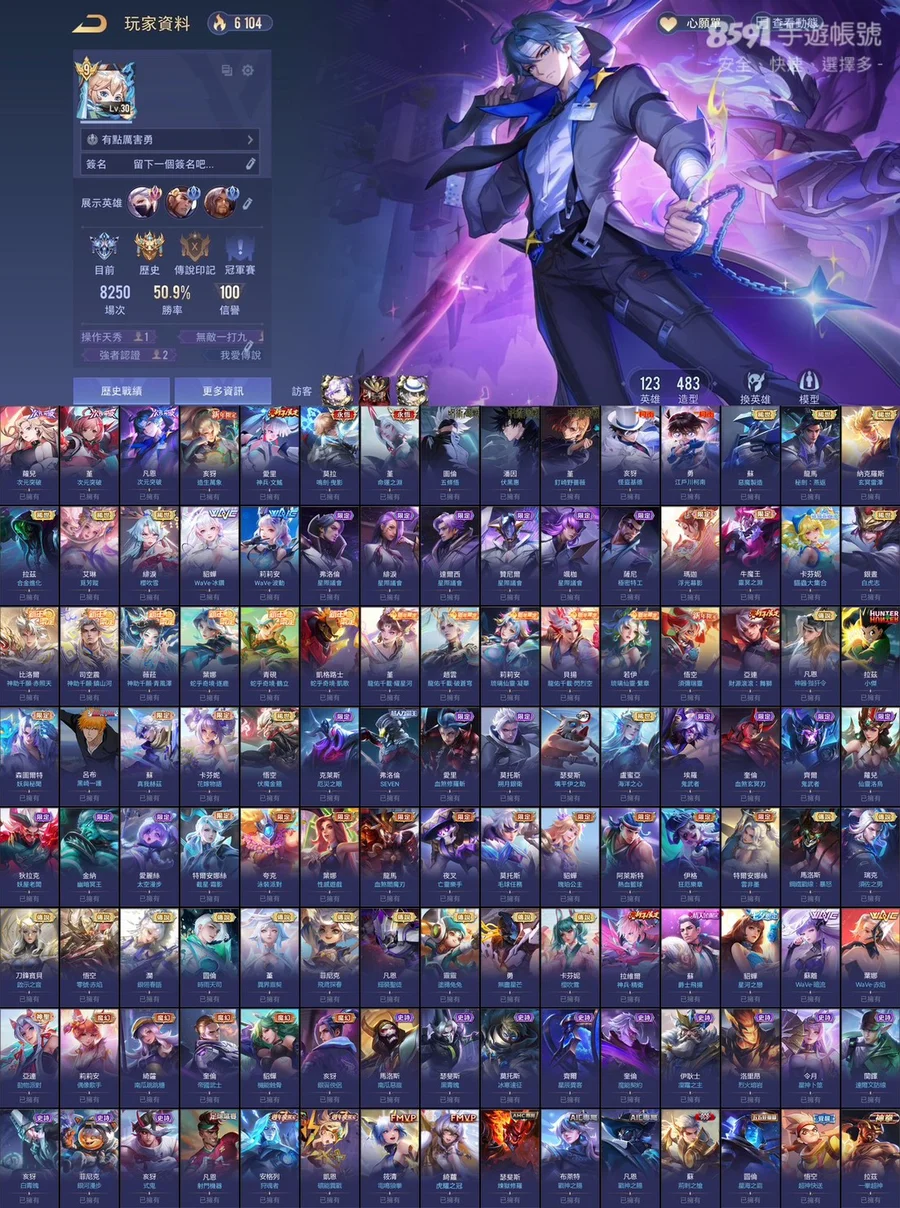 三次元突破!!近全英雄近五百造型!共123英雄483造型!勝率近51%!!共10次S戰場傳說印記!!常用奧義皆已升齊全!!超多課金抽獎造型!!