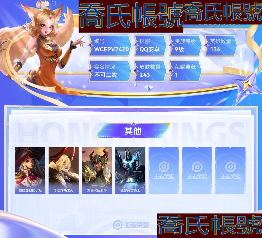 【OBWCEPV742042】 珍品傳說1 典藏1 傳說23 史詩75 限定95 英雄126 皮膚243 稀有英雄9 小國標1 貴族9級 總場次8937 皮膚價值:195244 【小國標1】 國服馬可波羅 【珍品傳說1】 馬可波羅怪盜基德 【榮耀典藏1】 諸葛亮星域神啟 【傳說皮膚23】 后羿神樹通天 裴擒虎祥瑞亨通 瀾願照九州拓 孫尚香乘龍問璇璣 夏洛特浮生妄 虞姬無限傾心 伽羅熾翼輝光 達摩黃金獅子座 李白詩劍行 狄仁傑神器狴犴令 宮本武藏地獄之眼 馬可波羅深海之息 后羿無盡星芒 虞姬啟明星使 曜李逍遙 狄仁傑超時空戰士 孫悟空零號赤焰 干將莫邪久勝戰神 百里玄策白虎志 伽羅太華 后羿黃金射手座 李白鳳求凰 孫尚香末日機甲 【史詩皮膚75】 弈星萬物之道 甄姬遊園驚夢 牛魔星界戰將 西施織夢人 狂鐵龍之律動 后羿石田雨龍 阿軻節奏熱浪 王昭君偶像歌手 蒙恬榮光聖徽 司空震地獄燃心 蒙犽百解令 阿古朵江河有靈 扁鵲奇幻香蹤 夏侯惇乘風破浪 暃星界遊俠 鎧曙光守護者 露娜紫霞仙子 呂布末日機甲 馬可波羅山海玄木吟 夢奇頑趣 阿古朵頑趣 墨子龍騎士 鍾無豔超時空戰士 花木蘭水晶獵龍者 鬼谷子五穀豐年 沈夢溪月團寄思 妲己女僕咖啡 裴擒虎天狼狩獵者 狂鐵電玩高手 不知火舞魅語 百里守約朱雀志 李元芳逐浪之夏 嬴政暗夜貴公子 夏洛特永晝 張良千籌問戰 明世隱吟遊魔法 宮本武藏鬼劍武藏 瀾賞金獵手 黃忠火炮紳士 蘭陵王暗隱獵獸者 魯班七號電玩小子 白起星夜王子 韓信傲雪梅槍 雅典娜黎明之約 項羽蒼穹之光 劉邦德古拉伯爵 雅典娜冰冠公主 劉禪天才門將 老夫子航海奇遇記 蒙犽龍鼓爭鳴 娜可露露晚螢 小喬繽紛獨角獸 阿軻暗夜貓娘 馬可波羅逐夢之星 孫尚香水果甜心 虞姬霸王別姬 張飛亂世虎臣 公孫離無限星賞官 蒙犽狂想玩偶喵 裴擒虎李小龍 百里玄策原初追逐者 馬可波羅暗影遊獵 孫策貓狗日記 孫尚香時之戀人 黃忠烈魂 橘右京修羅 李元芳銀河之約 后羿如夢令 嫦娥如夢令 韓信飛衡 狄仁傑魔術師 趙雲皇家上將 狄仁傑鷹眼統帥 李白千年之狐 妲己魅力維加斯 【年限皮膚8】 瀾願照九州拓 孫尚香乘龍問璇璣 馬可波羅山海玄木吟 百里守約朱雀志 百里玄策白虎志 韓信飛衡 伽羅太華 李白鳳求凰 【內測皮膚2】 弈星萬物之道 艾琳女武神 【限定皮膚95】 后羿神樹通天 弈星萬物之道 艾琳鶴鳴心箋 甄姬遊園驚夢 牛魔星界戰將 亞瑟榮光之誓 西施織夢人 狂鐵龍之律動 鬼谷子克喵 后羿石田雨龍 阿古朵布丁狗之約 蘇烈春野閒蹤 太乙真人謐流熔爐 瀾願照九州拓 馬可波羅怪盜基德 呂布逐霄戰戟 鬼谷子天穹祈燈 孫尚香乘龍問璇璣 張良古海尋蹤 蒙恬榮光聖徽 司空震地獄燃心 艾琳流音漫舞 蒙犽百解令 阿古朵江河有靈 魯班大師探海日誌 西施玲瓏珍味 扁鵲奇幻香蹤 裴擒虎擒濤扼浪 楊戩潮玩騎兵 夏洛特浮生妄 桑啟海鹽詩旅 暃星界遊俠 虞姬無限傾心 伽羅熾翼輝光 馬可波羅山海玄木吟 嫦娥暖冬兔眠 夢奇頑趣 狄仁傑神器狴犴令 后羿聖弓遊俠 鍾無豔超時空戰士 艾琳女武神 鬼谷子五穀豐年 李元芳雲中旅人 甄姬落雪蘭心 裴擒虎天狼狩獵者 狂鐵電玩高手 百里守約朱雀志 馬可波羅深海之息 沈夢溪大漠名商 后羿無盡星芒 王昭君午後時光 白起夜都怪俠 明世隱吟遊魔法 蘭陵王金庭之子 黃忠火炮紳士 羋月幻夜卜夢 韓信傲雪梅槍 達摩沙漠行僧 蘇烈千軍破陣 雅典娜黎明之約 虞姬啟明星使 老夫子航海奇遇記 墨子神蹟守衛 鍾馗驅儺正儀 曜李逍遙 馬可波羅逐夢之星 程咬金演武奪籌 虞姬霸王別姬 狄仁傑萬華元夜 孫悟空零號赤焰 蒙犽狂想玩偶喵 雅典娜單詞大作戰 裴擒虎李小龍 百里玄策白虎志 鬼谷子原初探秘者 百里玄策原初追逐者 馬可波羅暗影遊獵 豬八戒西部大鏢客 老夫子醍醐杖 黃忠烈魂 明世隱疑決卦 李元芳銀河之約 后羿如夢令 嫦娥如夢令 韓信飛衡 沈夢溪星空之諾 伽羅太華 狄仁傑魔術師 李白鳳求凰 弈星混沌棋 趙雲皇家上將 狄仁傑陰陽師 項羽海灘派對 夏侯惇朔風刀 盾山御鑾 【天幕1】 怪盜基德天幕 【其他102】 老夫子功夫老勺 哪吒次元突破 趙雲忍炎影 孫權徑山謀武 孫臏天使之翼 萊西奧踏浪烽翎 劉禪英喵野望 雲纓赤焰之纓 魯班七號福祿兄弟 孫悟空西部大鏢客 諸葛亮星航指揮官 諸葛亮掌控之力 金蟬前塵 姜子牙星夢巡禮 武則天東方不敗 馬超倖存者 韓信教廷特使 鍾無豔生化警戒 嫦娥露花倒影 米萊狄怪誕之夜 上官婉兒修竹墨客 后羿完美運算 曹操決勝大滿貫 蘭陵王幻夜行動 亞連破局者 海月王牌新星 呂布野性能量 伽羅花見巫女 魯班七號木偶奇遇記 鍾無豔海灘麗影 姬小滿零食大作戰 萊西奧西部遊俠 元歌午夜歌劇院 明世隱虹雲星官 曹操超能戰警 趙懷真太極少年 老夫子潮流仙人 甄姬花好人間 瑤森 桑啟畫中遊 豬八戒潮玩探月行 海月幻泉霧影 蒙犽歸虛夢演 艾琳女武神 鬼谷子阿摩司公爵 劉備潮玩造夢師 大喬守護之力 沈夢溪鯊炮海盜貓 戈婭危途狂花 百里守約絕影神槍 宮本武藏未來紀元 姜子牙熾熱元素使 安琪拉玩偶對對碰 蒙犽胡桃狂想曲 花木蘭劍舞者 大喬伊勢巫女 貂蟬異域舞娘 孫尚香沉穩之力 白起白色死神 劉禪秘密基地 小喬丁香結 魯班大師歸虛夢演 沈夢溪棒球奇才 典韋鐵甲之心 高漸離金屬狂潮 姜子牙時尚教父 狄仁傑錦衣衛 張良繽紛繪卷 李元芳特種部隊 蒼維京掠奪者 司空震啟蟄 瀾孤獵 達