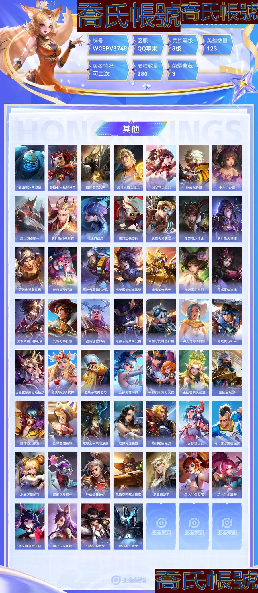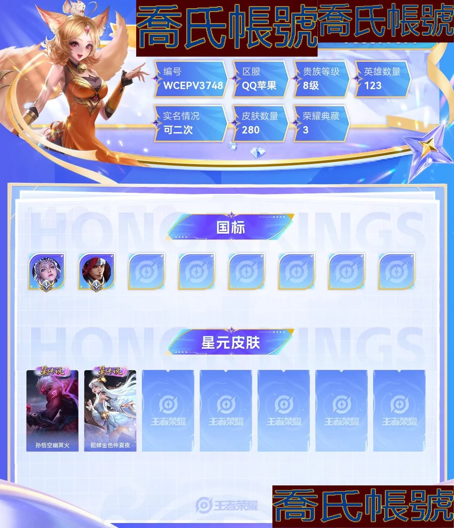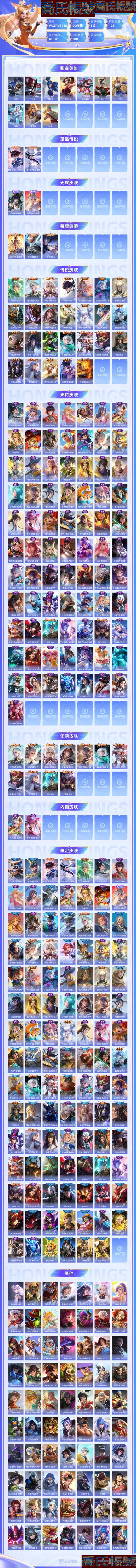 【OBWCEPV374842】 珍品傳說2 無雙2 典藏3 星元2 傳說26 史詩78 限定104 英雄123 皮膚280 稀有英雄10 小國標2 貴族8級 總場次31043 皮膚價值:254072 【小國標2】 國服露娜 國服韓信 【珍品傳說2】 魯班七號江戶川柯南 馬可波羅怪盜基德 【無雙皮膚2】 公孫離離恨煙 不知火舞花合鬥 【榮耀典藏3】 花木蘭九霄神輝 李白鳴劍曳影 小喬天鵝之夢 【星元皮膚2】 孫悟空幽冥火 貂蟬金色仲夏夜 【傳說皮膚26】 桑啟鳴野蒿 趙雲乘龍銘鐘鼎 李信山海熾霜斬 李白詩劍行 娜可露露前塵鏡 馬可波羅深海之息 露娜啟示之音 孫策末日機甲 鎧絳天戰甲 裴擒虎寅虎赤拳 鏡熾陽神光 孫尚香異界靈契 趙雲淬星耀世 虞姬啟明星使 曜雲鷹飛將 李信一念神魔 孫尚香末日機甲 諸葛亮時雨天司 公孫離祈雪靈祝 百里玄策白虎志 關羽武聖 呂布天魔繚亂 李白鳳求凰 花木蘭冠軍飛將 貂蟬仲夏夜之夢 孫悟空地獄火 【史詩皮膚78】 李白謫仙醉月 孫策貓狗日記 弈星熾弈燎原 少司緣塗山紅紅 姬小滿戰舞者 大司命東方月初 姬小滿妄想食味 暃埋骨錢 安琪拉魔法小廚娘 蒙恬榮光聖徽 夏侯惇乘風破浪 魯班七號電玩小子 瑤山海碧波行 夢奇頑趣 鬼谷子五穀豐年 明世隱吟遊魔法 艾琳奇遇舞章 瀾賞金獵手 公孫離玉兔公主 趙雲百木心槍 夏洛特永晝 雲中君時之祈願 楊玉環寅虎心曲 韓信傲雪梅槍 雅典娜黎明之約 花木蘭青春決賽季 嫦娥拒霜思 墨子金屬風暴 莊周高山流水 孫尚香薔薇戀人 豬八戒豬悟能 老夫子航海奇遇記 娜可露露晚螢 廉頗地獄巖魂 元歌雲間偶戲 花木蘭水晶獵龍者 妲己女僕咖啡 瑤遇見神鹿 程咬金功夫廚神 王昭君偶像歌手 大喬貓狗日記 劉邦德古拉伯爵 雲中君纖雲弄巧 蒙犽狂想玩偶喵 白起星夜王子 不知火舞魅語 宮本武藏鬼劍武藏 百里玄策原初追逐者 公孫離無限星賞官 橘右京修羅 趙雲未來紀元 狄仁傑魔術師 狄仁傑鷹眼統帥 李元芳逐浪之夏 蔡文姬繁星吟遊 蘭陵王馴魔獵人 魯班七號獅舞東方 趙雲皇家上將 鎧青龍志 干將莫邪冰霜戀舞曲 百里守約特工魅影 蘇烈玄武志 雅典娜冰冠公主 蘭陵王暗隱獵獸者 露娜一生所愛 小喬繽紛獨角獸 孫悟空至尊寶 甄姬冰雪圓舞曲 孫尚香水果甜心 曹操幽靈船長 韓信白龍吟 貂蟬聖誕戀歌 鍾無豔王者之錘 關羽冰鋒戰神 李白千年之狐 呂布聖誕狂歡 露娜紫霞仙子 妲己魅力維加斯 【年限皮膚11】 趙雲乘龍銘鐘鼎 瑤山海碧波行 李信山海熾霜斬 裴擒虎寅虎赤拳 楊玉環寅虎心曲 諸葛亮時雨天司 公孫離祈雪靈祝 百里玄策白虎志 李白鳳求凰 鎧青龍志 蘇烈玄武志 【內測皮膚2】 姬小滿妄想食味 孫尚香薔薇戀人 【限定皮膚104】 太乙真人謐流熔爐 呂布逐霄戰戟 魯班七號江戶川柯南 馬可波羅怪盜基德 桑啟鳴野蒿 李白謫仙醉月 弈星熾弈燎原 少司緣塗山紅紅 大司命東方月初 姜子牙天穹之誓 姬小滿妄想食味 暃埋骨錢 安琪拉魔法小廚娘 不知火舞花合鬥 周瑜熔金海岸 蒙恬榮光聖徽 劉邦劍破天穹 鬼谷子天穹祈燈 趙雲乘龍銘鐘鼎 張良古海尋蹤 魯班大師探海日誌 裴擒虎擒濤扼浪 瑤山海碧波行 李信山海熾霜斬 桑啟海鹽詩旅 李元芳雲中旅人 夢奇頑趣 鬼谷子五穀豐年 沈夢溪大漠名商 娜可露露前塵鏡 馬可波羅深海之息 明世隱吟遊魔法 蘭陵王金庭之子 露娜啟示之音 達摩沙漠行僧 白起夜都怪俠 公孫離玉兔公主 趙雲百木心槍 雲中君時之祈願 裴擒虎寅虎赤拳 楊玉環寅虎心曲 韓信傲雪梅槍 雅典娜黎明之約 花木蘭青春決賽季 嫦娥拒霜思 孫尚香異界靈契 莊周高山流水 孫尚香薔薇戀人 豬八戒豬悟能 蘇烈千軍破陣 墨子神蹟守衛 老夫子航海奇遇記 鍾馗驅儺正儀 程咬金演武奪籌 元歌雲間偶戲 虞姬啟明星使 亞瑟潮玩騎士王 諸葛亮時雨天司 公孫離祈雪靈祝 狄仁傑萬華元夜 雲中君纖雲弄巧 百里玄策白虎志 蒙犽狂想玩偶喵 關羽武聖 雅典娜單詞大作戰 鬼谷子原初探秘者 百里玄策原初追逐者 老夫子醍醐杖 呂布天魔繚亂 明世隱疑決卦 狄仁傑魔術師 李白鳳求凰 弈星混沌棋 蔡文姬繁星吟遊 蘭陵王馴魔獵人 周瑜赤蓮之焰 夏侯惇朔風刀 魯班七號獅舞東方 盾山御鑾 鍾馗神蹟守衛 趙雲皇家上將 牛魔御旌 鎧青龍志 干將莫邪冰霜戀舞曲 蘇烈玄武志 露娜一生所愛 米萊狄御霄 狂鐵御獅 典韋窮奇 羋月重明 曹操燭龍 太乙真人饕餮 白起猙 高漸離死亡搖滾 虞姬凱爾特女王 項羽海灘派對 孫悟空至尊寶 扁鵲鍊金王 鍾無豔王者之錘 關羽冰鋒戰神 孫臏妖精王 狄仁傑陰陽師 莊周蜃樓王 亞瑟獅心王 【其他123】 露娜命運加冕 劉備漢昭烈帝 張良天堂福音 曹操決勝大滿貫 西施歸虛夢演 大喬絨語心約 貂蟬長夏之憶 廉頗功夫炙烤 太乙真人圓桌騎士 朵莉亞金色潮汐 鍾無豔生化警戒 老夫子潮流仙人 諸葛亮掌控之力 甄姬花好人間 達摩拳王 牛魔牛運亨通 豬八戒潮玩探月行 李白範海辛 劉邦聖殿之光 周瑜海軍大將 司空震啟蟄 曹操超能戰警 桑啟畫中遊 鬼谷子幻樂之宴 牛魔西部大鏢客 程咬金愛與正義 劉邦虎嘯劍宗 程咬金無雙福將 暃碧珀緋影 馬可波羅潮玩牛仔 金蟬前塵 狂鐵特工戰影 阿古朵熊喵少女 黃忠芝加哥教父 張良一千零一夜 李元芳特種部隊 蒙犽歸虛夢演 女媧尼羅河女神 高漸離金屬狂潮 宮本武藏霸王丸 弈星踏雪尋梅 張飛五福同心 蒙恬秩序獵龍將 魯班大師乓乓大師 劉禪秘密基地 雲纓赤焰之纓 張良繽紛繪卷 