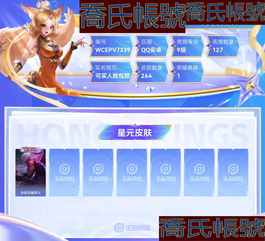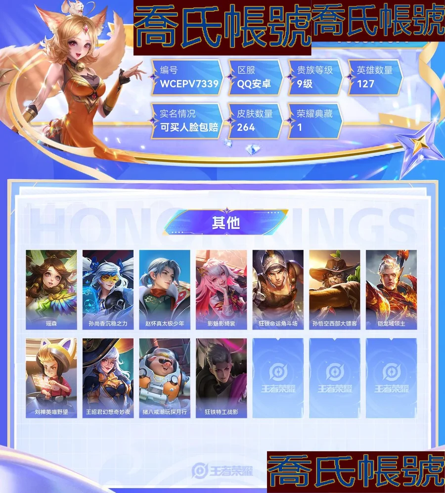 【OBWCEPV733942】 典藏1 星元1 傳說26 史詩88 限定96 榮耀水晶1 英雄127 皮膚264 稀有英雄10 貴族9級 總場次7382 皮膚價值:212352 【榮耀典藏1】 孫尚香殺手不太冷 【星元皮膚1】 孫悟空幽冥火 【傳說皮膚26】 后羿黃金射手座 干將莫邪千山共赴 諸葛亮時雨天司 孫悟空零號赤焰 虞姬啟明星使 關羽武聖 曜雲鷹飛將 劉備時之戀人 貂蟬貓影幻舞 呂布天魔繚亂 伽羅太華 楊戩永曜之星 諸葛亮武陵仙君 干將莫邪久勝戰神 虞姬雲霓雀翎 達摩黃金獅子座 夢奇胖達榮榮 百里玄策白虎志 花木蘭冠軍飛將 宮本武藏地獄之眼 貂蟬仲夏夜之夢 李白鳳求凰 狄仁傑超時空戰士 孫尚香末日機甲 孫悟空地獄火 孫尚香乘龍問璇璣 【史詩皮膚88】 蒙恬榮光聖徽 少司緣巫禮祀神 甄姬遊園驚夢 嬴政搖滾巨星 狂鐵龍之律動 羋月白晶晶 娜可露露晚螢 公孫離塗山容容 蒙犽百解令 甄姬冰雪圓舞曲 嬴政優雅戀人 妲己女僕咖啡 趙雲未來紀元 呂布御風驍將 廉頗地獄巖魂 莊周雲端築夢師 裴擒虎李小龍 百里玄策原初追逐者 白起星夜王子 宮本武藏鬼劍武藏 張飛虎魄 馬可波羅暗影遊獵 蔡文姬繁星吟遊 馬超神威 公孫離無限星賞官 上官婉兒天狼繪夢者 阿軻迷蹤麗影 劉禪天才門將 項羽蒼穹之光 黃忠烈魂 趙雲龍膽 阿軻節奏熱浪 墨子金屬風暴 瑤遇見神鹿 橘右京修羅 孫尚香水果甜心 不知火舞魅語 李元芳銀河之約 程咬金功夫廚神 妲己時之彼端 韓信飛衡 典韋岱宗 呂布聖誕狂歡 上官婉兒梁祝 百里守約特工魅影 魯班七號獅舞東方 狄仁傑鷹眼統帥 裴擒虎天狼狩獵者 伽羅箭羽風息 裴擒虎梅西 嬴政白晝王子 花木蘭瑞麟志 蘇烈玄武志 嬴政暗夜貴公子 露娜一生所愛 孫悟空大聖娶親 干將莫邪冰霜戀舞曲 李元芳逐浪之夏 趙雲引擎之心 百里守約朱雀志 鎧青龍志 亞瑟心靈戰警 曹操幽靈船長 孫策貓狗日記 張飛亂世虎臣 東皇太一逐夢之光 鎧曙光守護者 楊玉環遇見飛天 關羽冰鋒戰神 花木蘭青春決賽季 雅典娜冰冠公主 后羿輝光之辰 露娜紫霞仙子 阿軻暗夜貓娘 孫悟空至尊寶 韓信白龍吟 呂布末日機甲 魯班七號電玩小子 劉邦德古拉伯爵 小喬繽紛獨角獸 夏侯惇乘風破浪 蘭陵王暗隱獵獸者 狄仁傑魔術師 花木蘭水晶獵龍者 趙雲皇家上將 諸葛亮黃金分割率 李白千年之狐 安琪拉心靈駭客 【年限皮膚14】 呂布御風驍將 諸葛亮時雨天司 伽羅太華 楊戩永曜之星 韓信飛衡 典韋岱宗 百里玄策白虎志 花木蘭瑞麟志 蘇烈玄武志 百里守約朱雀志 鎧青龍志 后羿輝光之辰 李白鳳求凰 孫尚香乘龍問璇璣 【內測皮膚1】 嬴政優雅戀人 【限定皮膚96】 蒙恬榮光聖徽 少司緣巫禮祀神 艾琳鶴鳴心箋 甄姬遊園驚夢 張良羅小黑戰記 亞瑟榮光之誓 哪吒羅小黑戰記 鬼谷子克喵 狂鐵龍之律動 羋月白晶晶 干將莫邪千山共赴 公孫離塗山容容 甄姬逆浪荇歌 蒙犽百解令 魯班大師探海日誌 桑啟海鹽詩旅 李元芳雲中旅人 達摩沙漠行僧 蘇烈千軍破陣 嬴政優雅戀人 鍾馗驅儺正儀 程咬金演武奪籌 呂布御風驍將 諸葛亮時雨天司 狄仁傑萬華元夜 孫悟空零號赤焰 虞姬啟明星使 莊周雲端築夢師 裴擒虎李小龍 百里玄策原初追逐者 關羽武聖 鬼谷子原初探秘者 張飛虎魄 豬八戒西部大鏢客 馬可波羅暗影遊獵 蔡文姬繁星吟遊 老夫子醍醐杖 高漸離死亡搖滾 馬超神威 上官婉兒天狼繪夢者 劉邦奪寶奇兵 阿軻迷蹤麗影 黃忠烈魂 趙雲龍膽 呂布天魔繚亂 明世隱疑決卦 李元芳銀河之約 沈夢溪星空之諾 妲己時之彼端 伽羅太華 楊戩永曜之星 韓信飛衡 典韋岱宗 弈星混沌棋 夏侯惇朔風刀 諸葛亮武陵仙君 上官婉兒梁祝 鍾馗神蹟守衛 魯班七號獅舞東方 盾山御鑾 裴擒虎天狼狩獵者 牛魔御旌 女媧朔望之暉 嬴政白晝王子 百里玄策白虎志 花木蘭瑞麟志 蘇烈玄武志 露娜一生所愛 孫悟空大聖娶親 干將莫邪冰霜戀舞曲 趙雲引擎之心 百里守約朱雀志 鎧青龍志 米萊狄御霄 呂布獵獸之王 東皇太一逐夢之光 狂鐵御獅 楊玉環遇見飛天 關羽冰鋒戰神 狄仁傑陰陽師 典韋窮奇 羋月重明 花木蘭青春決賽季 后羿輝光之辰 太乙真人饕餮 李白鳳求凰 孫悟空至尊寶 白起猙 狄仁傑魔術師 趙雲皇家上將 項羽海灘派對 張良古海尋蹤 孫尚香乘龍問璇璣 阿古朵布丁狗之約 鬼谷子天穹祈燈 鍾馗虛靈犬護 【其他109】 馬超倖存者 萊西奧西部遊俠 亞瑟死亡騎士 韓信街頭霸王 諸葛亮星航指揮官 萊西奧踏浪烽翎 雲纓赤焰之纓 桑啟青衿臨川 雅典娜戰爭女神 姜子牙星夢巡禮 扁鵲救世之瞳 米萊狄精準探案法 露娜緋紅之刃 蒙恬蔚藍守將 鍾無豔聚星閃耀 程咬金無雙福將 明世隱占星師 花木蘭劍舞者 鬼谷子幻樂之宴 劉禪秘密基地 劉備紐約教父 張飛五福同心 魯班大師乓乓大師 張良繽紛繪卷 宮本武藏永珍初新 楊戩次元傲視 鏡冰刃幻境 關羽龍騰萬里 李元芳特種部隊 甄姬花好人間 哪吒次元突破 阿古朵熊喵少女 盾山圓桌騎士 曜歸虛夢演 盤古創世神祝 宮本武藏霸王丸 達摩大發明家 沈夢溪鯊炮海盜貓 露娜哥特玫瑰 哪吒三太子 李白範海辛 大喬守護之力 曹操死神來了 李白敏銳之力 典韋黃金武士 雅典娜神奇女俠 楊戩埃及法老 小喬丁香結 諸葛亮掌控之力 司馬懿魘語軍師 周瑜海軍大將 莊周奇妙博物學 鬼谷子阿摩司公爵 劉備萬事如意 白起白色死神 伽羅花見巫女 黃忠芝加哥教父 百里玄策威尼斯狂歡 豬八戒年年有餘 明世隱虹
