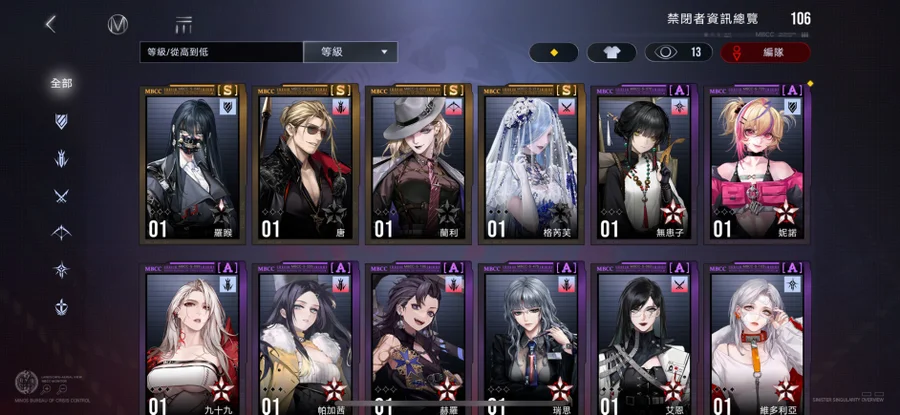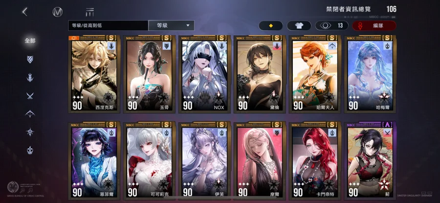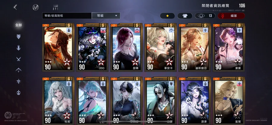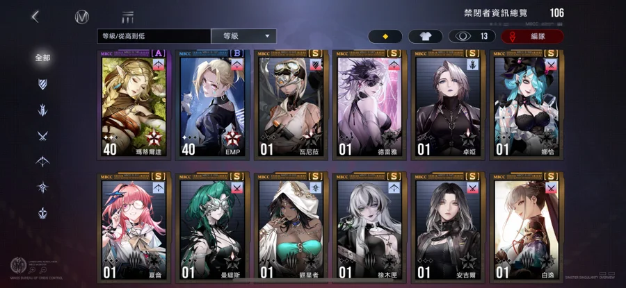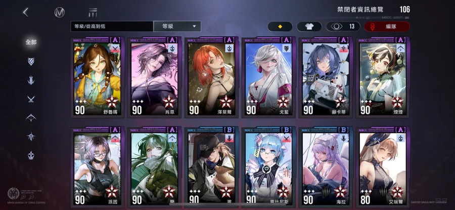 - A、B 級角色幾乎都有,幾乎都滿鎖