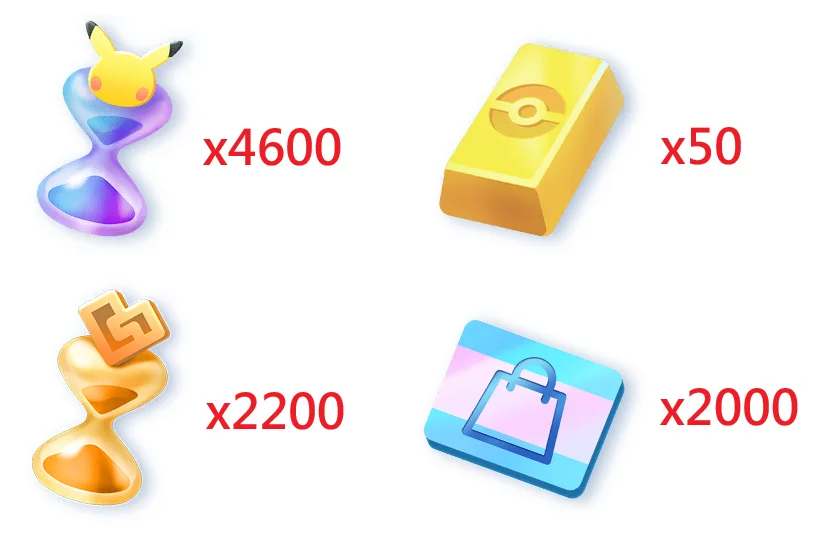 | 編號 | 開包沙漏 | 挑戰沙漏 | 寶可夢金磚 | 閃亮沙子 | 總卡數 | 商店券 | 其他 | 總抽數 |