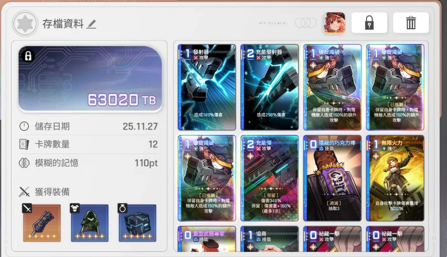 各項操作會增加存檔容量,若複製過多「神閃牌」跟刪除卡牌可能造成存檔無法正常帶出。