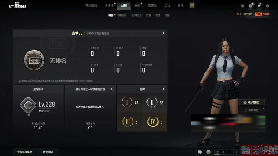 生存等級728;異色皮膚1;成長型武器1;槍皮37;載具7;