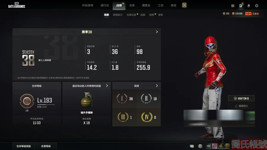 生存等級193;槍皮47;載具5;傳說武器:暗影纏身-AKM;傳說時裝:維納
