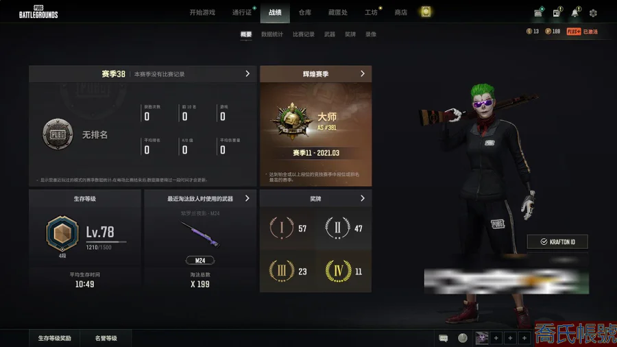 生存等級1578;成長型武器6;槍皮97;載具24;熱門物品:PAI2019夾