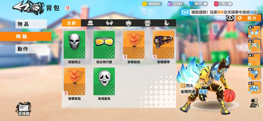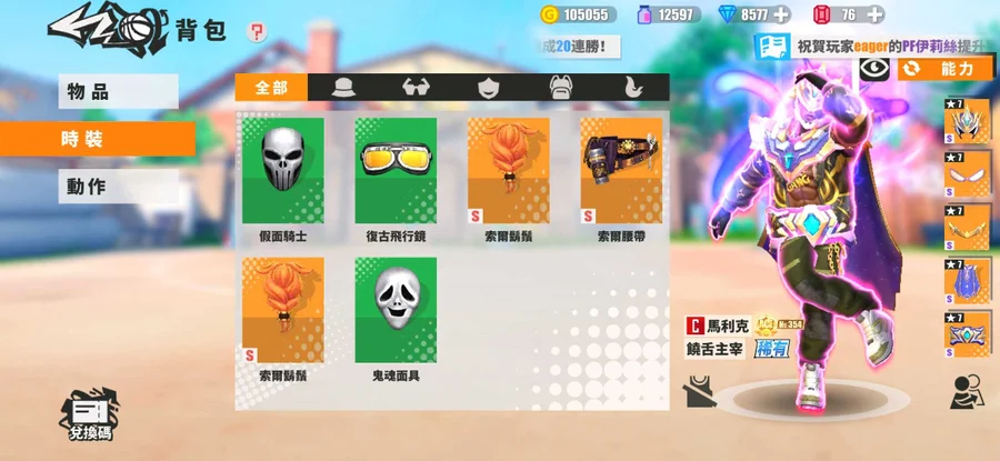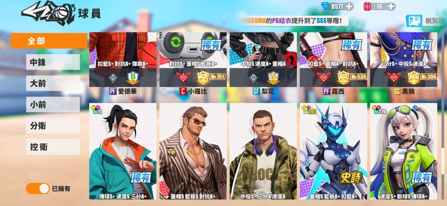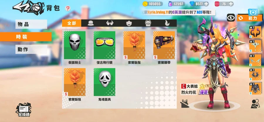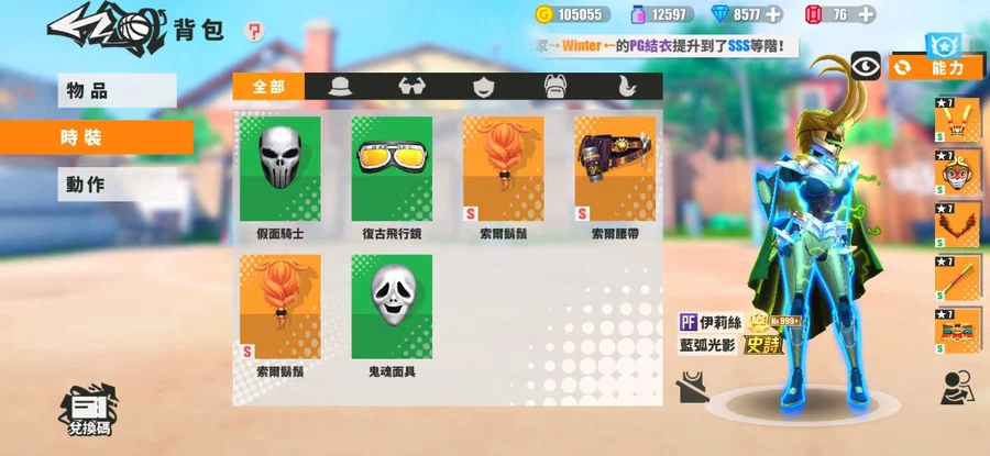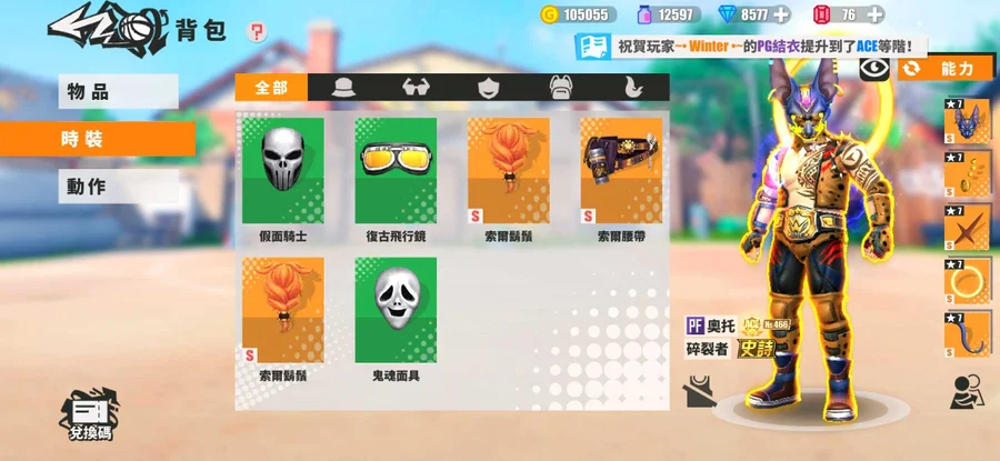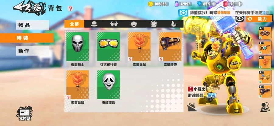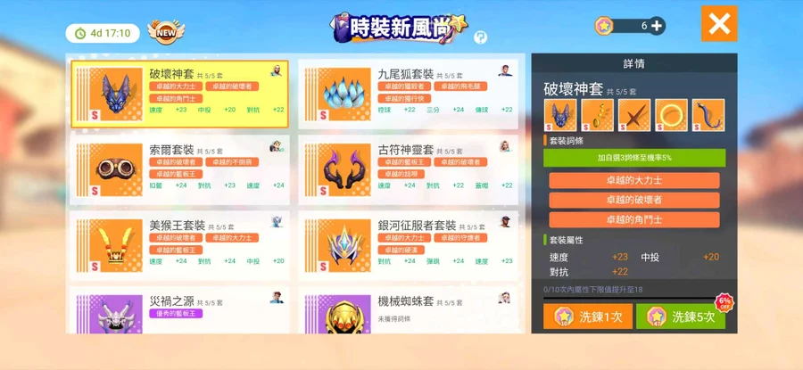 目前擁有頂級橘套 6 件2紫,可依角色自由替換。