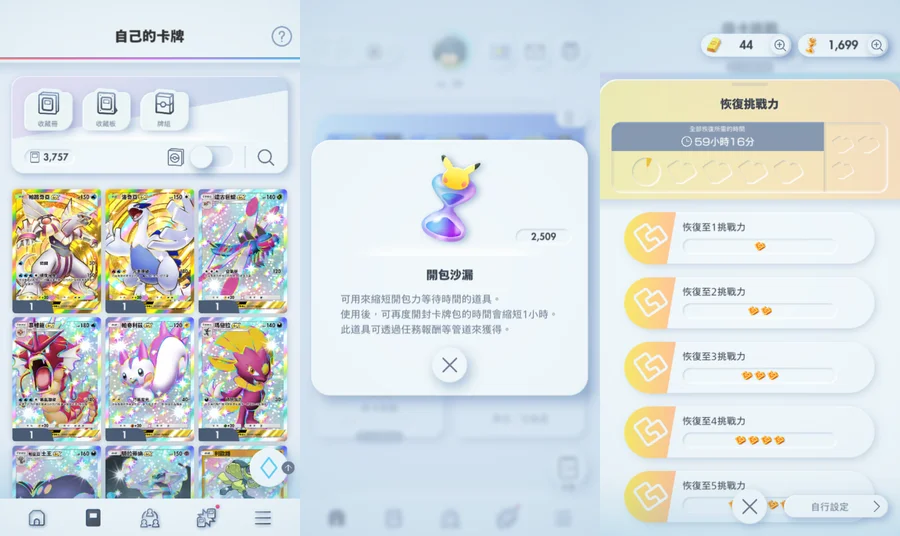 資源量: 3757 卡、2509 開包沙漏、1699 挑戰沙漏、44金塊