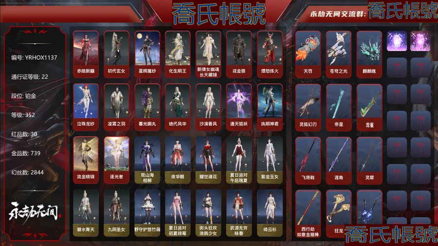 【YJYRHOX113711】30紅739金|等級352|鉑金|幻絲2844|金磚11|通行證Lv.22 紅色神品:赤皓新囍,初代玄女,星輝魔紗,化生明王,新倩女幽魂·長天藏錦,戎金狼,熛怒煉火,墨離,泣珠龍紗,凌霄之羽,暮光胴丸,絕代風華,沙漠香風,通天狐襖,執明神君,流金曉錦,逐光者,天罰,蒼穹之光,麒麟魄,靈狐幻刃,帝星,龍雀,飛將戟,涯角,靈犀,西行劫·如意金箍棒,狂龍,驚百里 角色金色皮膚:觀山海·相柳,夜華朝,耀世魂花,夏日派對·午後瑰夏,紫金玉女,碧水青天,九陰聖女,綠野守護·悠竹萌客,夏日派對·初夏緋莓,街頭狂歡·塗鴉少女,武道無窮·詠春,綺雲衫,西行劫·紫衣仙子,絮雲衣,冬日綺韻·白熊,九驪之君,夏日派對·夏海伏浪,武道無窮·少林,西行劫·悟淨,春日序曲·朝顏,開闢鴻蒙·風雨諧,夏日派對·長夏清瀾,智繪·萍之緣,沐昭,新倩女幽魂·瑤光沐月,新倩女幽魂·流紈裙,怪誕狂想·友情歲月,鬥羅大陸·唐三,噬月天狼,龍之影·龍虎鬥,蒼狼之主,追獵,不良人·李星雲,長歌詩韻·鷓鴣天,巫師3·傑洛特,巨闕,庖丁·食神,瑞火麟,龍之影·精武魂,遊四海,洛天依·星空投影,巔峰極速·小可,怦然心動·軟暖甜夢,長歌詩韻·遣唐使,春日序曲·晨風,夏日派對·高校水著,山吹茶,御宅羅夢,陰陽姬,清雅少女,狩獵都市·暗夜利刃,決戰平安京·戀念私語,千秋匠心·青枝瓷,決戰平安京·熱海白珊,妖刀姬,汐淚,庖丁·餚嬋,綠野守護·暗沼摩羅,封神錄·敖丙,楚韻九歌·湘夫人,赤霧煙霞,夏日派對·弄潮逐浪,蟄龍吟,龍之道·無拘,2674·爭鬥洪流,複製體·尼爾,百戰·破荊者,弘毅袍,魔傑·撼山嶽,華夏寶甲·漢光,龍之影·過江龍,P5R·雨宮蓮JOKER,黃庭道,梨園傳奇·柳生,封神錄·申公豹,司天命,幽篁山鬼,若谷,春日序曲·寒芷,祿運玉霄,封神錄·龍吉公主,金襦玉衫,夏日派對·仲夏霜華,梨園傳奇·小青,赤丹朱湛,寒英素雪,姑射真人,麟鹿大鎧,蒼雷丸,倒反陰陽·凜冬,巔峰極速·蕾雅,千秋匠心·玉葉景,觀山海·青鳥,夜吻,火羅聖女,龍門·飛天,驚雲羽,浣煙紗,瀚海蒼鷹,福瑞天澤,葫蘆兄弟·蛤蟆頭領,觀山海·秋神蓐收,西行劫·悟空,斑斕衣,英雄袍,熾火照夜,春日序曲·夜汐,封神錄·哪吒,夏日派對·盛夏白陽,干將莫邪,武道無窮·八極,觀山海·冬神玄冥,春不斂,赤陽天狐,夏日派對·赤夏悠漾,封神錄·妲己,護世四法·廣目天王,日影花陰,武道無窮·形意,黃昏巫主,卷王,楚韻九歌·雲中君,夜綢袍,長歌詩韻·念奴嬌,夏日派對·半夏晚風,封神錄·姜子牙,夏日派對·逐浪砂陽,綠野守護·山漠獰影,夏日派對·極光夏夜,暖冬茶馨,雪鈴綺歌,長歌詩韻·如夢令,狩獵都市·雷行獵手 髮型金色皮膚:簪纓發,百靈發,韶光發,綠野守護·嬌憨發,(挑染)白芷發,子菀發,伏苓發,春日序曲·蜜芙發,鬥羅大陸·海神發,逆水寒·江海發,烈火發,巫師3·白狼發,不良人·三聖涅發,月丹發,月下香發,怦然心動·戀歌發,洛天依·投影發,碎浪發,弄潮發,(挑染)填海發,綠野守護·冷傲發,皰丁·沸涓發,立靖仇驗發,(挑染)清威發,竹律發,P5R·JOKER髮型發,(挑染)羽客發,冰凌發,靈兒發,霜天發,封神錄·紅鸞星發,緋霜發,春日序曲·冰露發,(挑染)凜威發,閻摩發,雀翎發,翔鸞發,觀山海·青鸞發,千秋匠心·琳琅發,觀山海·天刑發,(挑染)戾君發,(挑染)霧灼發,流螢發,繾綣發,幽焰發,觀山海·冥泉發,春日序曲·夜瀾發,古溪發,護世四法·淨天發,封神錄·籠煙芍藥發,(挑染)商月發,驚雀發,秀逸發,長歌詩韻·豪傑發,(挑染)玄冥發,封神錄·仙風發,(挑染)風吹雪發,(挑染)逐影發,蜜語發,(挑染)璀璨發,虹貓藍兔七俠傳·藍髮,長歌詩韻·沉醉發,狩獵都市·迅猛發 武器金色皮膚:驚火弦,御氣弩,穿雲燕,咕咕,天牛翼,鎮海,狂嘯,朱雀,沉默審判,戲祥雲,綠野守護·雨幕,引冰落,金蠍,玉飛梭,螢火,石中火,天心玉,雪國禮炮,雷落,鑽山,觀山海·嘉果花,火羅衛,竹霹靂,貔貅吞寶,丹鶴,凝冰魄,赤霞,虎踞,鸚鵡螺,星追月,心魔,月虹弦角,烏木弓,豹胎易筋弓,逆逢,轉輪弓,仙毫,青花,日輝,蓮心劍雨,炎魔,不良人·華陽針,翠影,詭刃八岐,醒獅,蒼雷破,無相印,綠野守護·毛乎乎,熾意炎拳,天狐,2674·超越型,不良人·龍泉劍,財神劍,玉霜龍,亢龍,隱鋒,監星尺,富春山居·雲山青,西行劫·紫金寶劍,俠骨·清光引,劫燼·煉,降龍木,冷香,壺中日月,含光承影,殘陽,拂雪絨,鎏金勺,邪尾,黑繩,櫻華,泡泡棒,雷厲,白鹿,燭淚,斬銀河,塑夢鑰匙,決戰平安京·夢枕,青石猊,千秋匠心·素瓷,破天,龍蟠,山君怒,雷王鋸,聽濤,陰陽師·妖刀,闊刀-陰陽師·赤影妖刀,星輝環月,斷月影,麒麟牙,劫濤·潮,西行劫·三尖兩刃刀,滄螺溯浪,鎮山河,仙彩,靈木角,藤魂,觀山海·金神鉞,劫垢·堀,銀鐮槍,焦鈺,雪夜·清光引,建木,委蛇矛,白虹,寶月琉璃,糖果棍,冰輝,武道無窮·封魔,學宮之杖,倒馬棍,戒律杖,判官筆,夏日派對·西瓜棒冰,2674·獵刃,橈尺刀,雪殘梅,仙舞,鶴唳,華夏神兵·馬首刀,青峰疊扇,墨絨羽扇,騰雲歌,耀夜流華,葉底花,鐵羽,逍遙,咯咯,夔牛槌,傲骨,月瞳,嘶風,銜谷,鎮魔杵,九霄寒,精武,詭月·鏈魂,空寒,古墓麗影·登山鎬,蛋仔派對·鹹魚,怨憎,武道無窮·雙蝶,無救,新月,破重雲,隱天淵,觀山海·水衡 飾品金色皮膚:白菜頭,劫杯·戰神,玄陶俑面·女,目瞪馬呆·女,雁落笠,魂花耀,一品紅,委蛇朱冠,競無間·女,暖冬帽·女,美團·團上頭了,植物大戰殭屍2·腦子給我,西行劫·蛛絲墜,輝晶星辰,綠野守護·絨絨貓,夏日派對·兔兔髮箍,系雲瀾,觀山海·腓耳,希希,觀山海·腓尾,2674·心