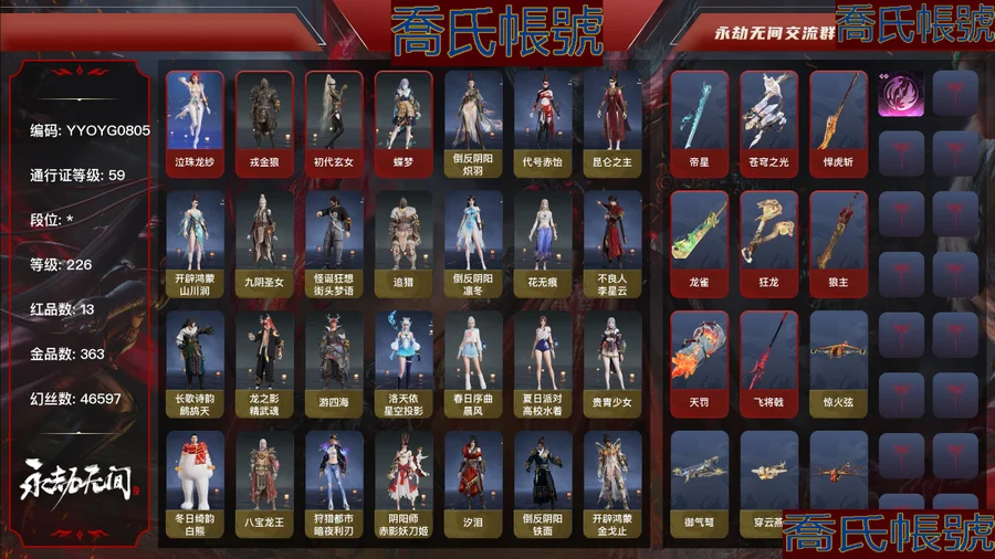 【YJYYOYG080511】13紅363金丨等級226丨丨金磚565丨幻絲46597丨通行證已升級Lv.59丨紅色神品:帝星,蒼穹之光,悍虎斬,龍雀,狂龍,狼主,泣珠龍紗,戎金狼,初代玄女,蝶夢,墨離,天罰,飛將戟,變身器:珥冰,神烏造像,甜夜安眠·幻夢鯨彩,應龍號,2674·初代機,噬骨,角色金色皮膚:倒反陰陽·熾羽,代號·赤飴,崑崙之主,開闢鴻蒙·山川潤,九陰聖女,怪誕狂想·街頭夢語,追獵,倒反陰陽·凜冬,花無痕,不良人·李星雲,長歌詩韻·鷓鴣天,龍之影·精武魂,遊四海,洛天依·星空投影,春日序曲·晨風,夏日派對·高校水著,貴胄少女,冬日綺韻·白熊,八寶龍王,狩獵都市·暗夜利刃,陰陽師·赤影妖刀姬,汐淚,倒反陰陽·鐵面,開闢鴻蒙·金戈止,2674·爭鬥洪流,弘毅袍,龍之影·過江龍,P5R·雨宮蓮JOKER,靈鹿巫者,朝聞道,祿運玉霄,禍津素盞,麟鹿大鎧,九州遺珍·福壽仙,甜夜安眠·鵝黃紗夢,開闢鴻蒙·風雨諧,新倩女幽魂·瑤光沐月,P5R·奧村春NOIR,怦然心動·悅彩遊裳,街頭狂歡·塗鴉少女,絕倫袍,福瑞天澤,冬無歸,熾火照夜,羽影,春不斂,赤陽天狐,春日序曲·赤羽,卷王,冥淵,天工奧妙,沙海之鳩,長歌詩韻·念奴嬌,虹貓藍兔七俠傳·虹貓,雲間影,赤焰戰靈,夏日派對·極光夏夜,開闢鴻蒙·日月明,雪鈴綺歌,虹貓藍兔七俠傳·藍兔,長歌詩韻·如夢令,狩獵都市·雷行獵手,甜蜜心動,玄陶俑面·女,目瞪馬呆·女,玄陶俑面·男,目瞪馬呆·男,美團·團上頭了,紅絨暖·男,瑞獅頭,福虎帽,浮元子,陰陽靈狐,冬日綺韻·熊熊頭,鮫人尾,倒反陰陽·鑑心冠,甜夜安眠·絨熊奶泡,魔燭帽,P5R·NOIR的帽子,怦然心動·喵彩,輝晶星辰,虎絨耳,纖蝶絨輕,繃帶頭套,季中賽2025·瀚沙,虹貓藍兔七俠傳·虹光,虹貓藍兔七俠傳·長風,安樂冠,玉蓮冠,虹貓藍兔七俠傳·赤龍,夜露帽,開闢鴻蒙·凜寒星,鹿鈴角,神愈之冕,虹貓藍兔七俠傳·寒月,虹貓藍兔七俠傳·落花,百戲碗,虹貓藍兔七俠傳·雪團,狩獵都市·碎空龍尾,驟雷鏢旗,髮型金色皮膚:(挑染)泠川發,逆水寒·江海發,倒反陰陽·銘誓發,(挑染)凜威發,伏苓發,(挑染)霧灼發,白鴉發,(挑染)酷洛米·雙色捲髮發,月魄發,秀逸發,長歌詩韻·豪傑發,虹貓藍兔七俠傳·虹發,蜜語發,(挑染)牽雲霞發,長歌詩韻·沉醉發,虹貓藍兔七俠傳·藍髮,狩獵都市·迅猛發,2674·遊隼,武器金色皮膚:驚火弦,御氣弩,穿雲燕,朱雀,沉默審判,戲祥雲,石中火,雪國禮炮,竹霹靂,貔貅吞寶,雲朵咩咩,丹鶴,夢魘,腥紅之月,蓮心劍雨,炎魔,2674·超越型,不良人·龍泉劍,虹貓藍兔七俠傳·長虹劍,虹貓藍兔七俠傳·冰魄劍,赤霄,福祿雙至,華夏神兵·永樂寶劍,壺中日月,殘陽,毅魂守,邪尾,碎星河,數珠丸,斬銀河,塑夢鑰匙,聽濤,陰陽師·赤影妖刀,滄螺溯浪,鎮山河,長虹,建木,聖山瞳刃,判官筆,刺冥,2674·獵刃,仙舞,華夏神兵·馬首刀,嘶風,鎮魔杵,破劫·飛金,精武,詭月,朧夜狐影,蛋仔派對·鹹魚,西摩格鐮,破重雲,糖果棍,打狗棒,千鈞羽,星輝環月,劫濤·潮,曜金紫珀,光影裁決,勾魂,青峰疊扇,拳皇·舞扇,騰雲歌,千堆雪,倒反陰陽·盡春鋒,紗彩陽傘,天狼遺鋒,詭刃八岐,醒獅,蒼雷破,綠野守護·毛乎乎,鎮惡,不良人·華陽針,玄銅飛軍,翠影,醉花風,, 【Steam】【國服】帶steam賬號 有好多經典遊戲 都是豪華版帶dlc