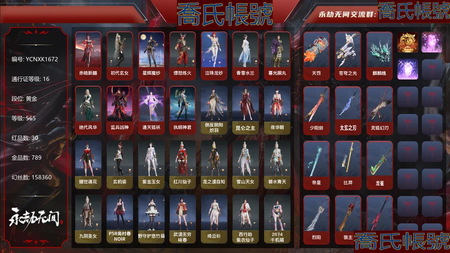 【YJYCNXK167211】30紅789金|等級565|黃金|幻絲158360|金磚472|通行證Lv.16 紅色神品:赤皓新囍,初代玄女,星輝魔紗,熛怒煉火,墨離,泣珠龍紗,香雪水蘭,暮光胴丸,絕代風華,監兵凶神,通天狐襖,執明神君,天罰,蒼穹之光,麒麟魄,少陽劍,太玄之刃,靈狐幻刃,帝星,比羿,龍雀,烈陽,狼主,飛將戟,靈犀,西行劫·如意金箍棒,狂龍,鳳求凰 角色金色皮膚:倒反陰陽·熾羽,崑崙之主,夜華朝,耀世魂花,玄豹姿,紫金玉女,紅川仙子,龍之道·自知,雪山天女,碧水青天,九陰聖女,P5R·奧村春NOIR,綠野守護·悠竹萌客,武道無窮·詠春,綺雲衫,西行劫·紫衣仙子,2674·千機喵,冬日綺韻·白熊,武道無窮·少林,若水尊者,龍之影·生死局,覺之一念,八寶龍王,裟伽龍王,甜夜安眠·鵝黃紗夢,開闢鴻蒙·風雨諧,智繪·萍之緣,沐昭,新倩女幽魂·瑤光沐月,新倩女幽魂·花間影,新倩女幽魂·流紈裙,不良人·李星雲,長歌詩韻·鷓鴣天,巫師3·傑洛特,觀山海·夏神祝融,龍心熾焰,龍之影·精武魂,逆水寒·江海滄瀾,醉山川,遊四海,洛天依·星空投影,長歌詩韻·遣唐使,山吹茶,輝燁少女,龍之道·至純,天鈿女命,御宅羅夢,陰陽姬,清雅少女,貴胄少女,流火映真,陰陽師·灼舞桃節,妖刀姬,綠野守護·暗沼摩羅,封神錄·敖丙,巨鯨客,夏日派對·弄潮逐浪,蟄龍吟,掌珠仙子,龍之道·無拘,鎮海龍,倒反陰陽·鐵面,複製體·尼爾,新魔傑·斬魔天將,西行劫·楊戩,常勝袍,百戰·破荊者,弘毅袍,龍之影·過江龍,輝光,守誓者,驍騎,黃庭道,封神錄·申公豹,司天命,一品仙君,幽篁山鬼,朝聞道,未濟袍,金羽客,若谷,祿運玉霄,封神錄·龍吉公主,藏雨閣主,赤丹朱湛,寒英素雪,禍津素盞,蒼雷丸,倒反陰陽·凜冬,觀山海·青鳥,神鷹之女,驚雲羽,浣煙紗,金羽聖鷹,璨銀魔梟,瀚海蒼鷹,福瑞天澤,觀山海·秋神蓐收,西行劫·悟空,行空裘,冬無歸,封神錄·哪吒,護世四法·持國天王,觀山海·冬神玄冥,春不斂,封神錄·妲己,護世四法·廣目天王,黃昏巫主,天工奧妙,夜綢袍,長歌詩韻·念奴嬌,觀山海·文鰩,虹貓藍兔七俠傳·虹貓,赤誠心,封神錄·姜子牙,雲間影,綠野守護·山漠獰影,古冢行,雪鈴綺歌,虹貓藍兔七俠傳·藍兔,長歌詩韻·如夢令 髮型金色皮膚:縹緲發,簪纓發,百靈發,韶光發,綠野守護·嬌憨發,P5R·NOIR髮型發,緣覺發,(挑染)白芷發,子菀發,蘇木發,紫芙發,伏苓發,甜夜安眠·暖絨發,九州遺珍·春桃發,(挑染)白芷發,逆水寒·江海發,(挑染)熛怒發,巫師3·白狼發,不良人·三聖涅發,(挑染)櫻舞發,月丹發,月下香發,洛天依·投影發,(挑染)沸海發,碎浪發,激浪發,安瀾發,鯨海發,浩渺發,綠野守護·冷傲發,倒反陰陽·銘誓發,靖仇發,(挑染)萬仞山發,竹律發,九梁發,冰凌發,西行劫·望舒發,封神錄·紅鸞星發,緋霜發,閻摩發,(挑染)忠嘉發,(挑染)鳳姿發,翔鸞發,夕鷹發,觀山海·青鸞發,玉兒發,觀山海·天刑發,(挑染)戾君發,(挑染)宵燭發,觀山海·冥泉發,流螢發,護世四法·妙音發,幽焰發,鶴髮,古溪發,封神錄·籠煙芍藥發,護世四法·淨天發,驚雀發,秀逸發,長歌詩韻·豪傑發,(挑染)玄冥發,虹貓藍兔七俠傳·虹發,封神錄·仙風發,靜流發,鶴姿發,蜜語發,長歌詩韻·沉醉發,虹貓藍兔七俠傳·藍髮,(挑染)雷霆客發 武器金色皮膚:驚火弦,千機弩,雨歇,狂嘯,朱雀,沉默審判,戲祥雲,綠野守護·雨幕,引冰落,金蠍,玉飛梭,獵獁銃,出淵蛟,天心玉,雪國禮炮,雷落,鑽山,觀山海·嘉果花,造景,墨雙戟-不歸,火羅衛,竹霹靂,吞海鮫,龍息,龍嘯,丹鶴,凝冰魄,長歌詩韻·夜觀燈,虎踞,迎宵,爐中火,星追月,心魔,烏木弓,轉輪弓,風馳弓,青花,春水,日輝,腥紅之月,暝蛇引,蓮心劍雨,炎魔,不良人·華陽針,玄銅飛軍,翠影,醒獅,無相印,綠野守護·毛乎乎,熾意炎拳,天狐,2674·超越型,不良人·龍泉劍,虹貓藍兔七俠傳·長虹劍,虹貓藍兔七俠傳·冰魄劍,財神劍,琴心,玉霜龍,亢龍,隱鋒,監星尺,俠骨·清光引,劫燼·煉,燭神令,降龍木,鎮魔尺,華夏神兵·永樂寶劍,含光承影,陰陽師·傘劍,殘陽,金玉一文字,劫燼·燎,櫻華,雷賜,數珠丸,倒反陰陽·盡春鋒,白鹿,燭淚,青石猊,赤雲之刃,龍蟠,陰陽師·魂夢殘響,山君怒,雷王鋸,決戰平安京·神罰之刃,惡障,聽濤,暮影,星輝環月,千鈞羽,麒麟牙,劫濤·潮,鬥羅大陸·昊天,觀山海·朱明,鎮山河,靈木角,觀山海·金神鉞,焦鈺,長虹,雪夜·清光引,建木,凌雲志,委蛇矛,玄鯨骨叉,擊蒼穹,白虹,寶月琉璃,糖果棍,護世四法·降魔,武道無窮·封魔,倒馬棍,2674·貳型電漿杖,戒律杖,打狗棒,判官筆,刺冥,橈尺刀,三更令,仙舞,鶴唳,化魄,尋魂,華夏神兵·馬首刀,鷹吻,殘霄,青峰疊扇,騰雲歌,耀夜流華,櫻落,千堆雪,逍遙,夔牛槌,月瞳,嘶風,除歲,法持,銜谷,鎮魔杵,九霄寒,降魔手,地火湧,虎擺,玉矩,精武,破劫·赤刃無雙,空寒,古墓麗影·登山鎬,無救,禍忌,天之刑,絕潮汐,破重雲,曜金紫珀,撼龍,護世四法·螭龍,觀山海·水衡 飾品金色皮膚:白菜頭,自動人形·埃米爾,劫杯·戰神,甜蜜心動,玄陶俑面·女,目瞪馬呆·女,雁落笠,魂花耀,一品紅,美團·團上頭了,植物大戰殭屍2·腦子給我,西行劫·蛛絲墜,搖清楓,P5R·NOIR的帽子,輝晶星辰,綠野守護·絨絨貓,夏日派對·兔兔髮箍,系雲瀾,妙法兜帽,冬日綺韻·熊熊頭,炎流雲禪笠,玄陶俑面·男,目瞪馬呆·男,甜夜安眠·絨熊奶泡,魔燭帽,靈蘭,巫師3·驢耳朵,甲辰龍,雪鹿雄角,醒獅頭,浪焰青藤帽,福虎帽,狐靈面,浮元子,立烏帽,冰鏈,毒刺,鐵護臂,暗香,雪鹿雌角,封神錄·驍雄,鮫人尾,倒反陰陽·鑑心冠,凱旋盔,華夏