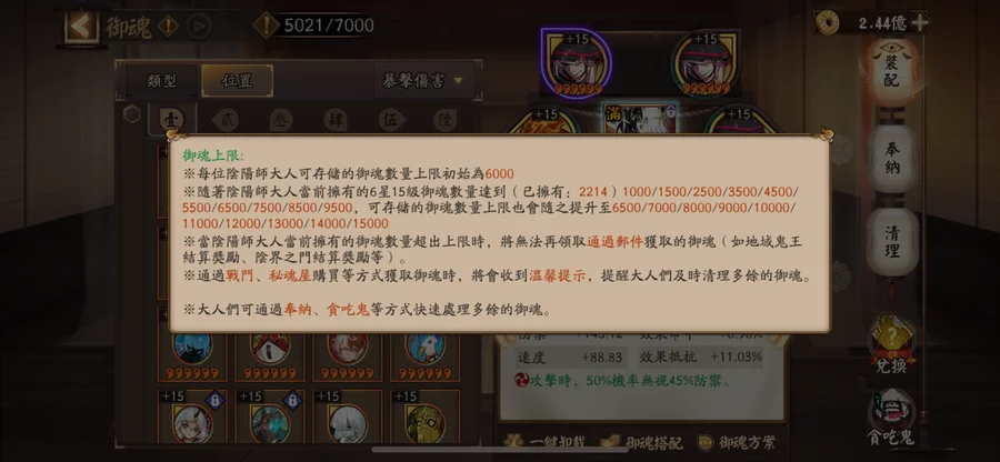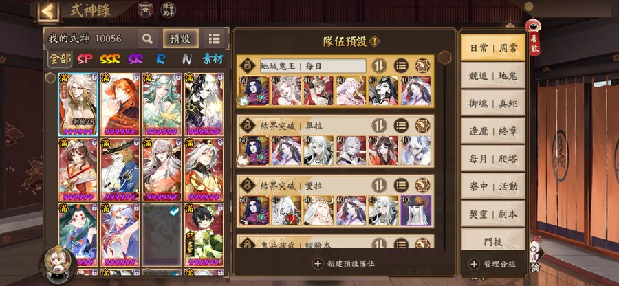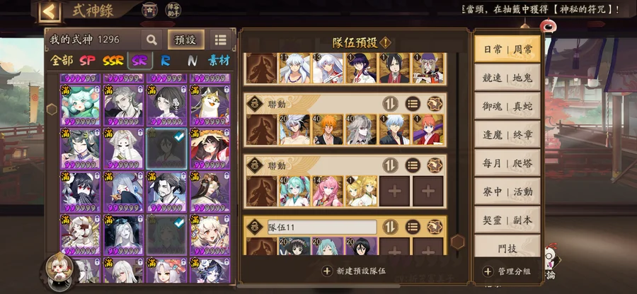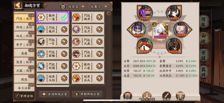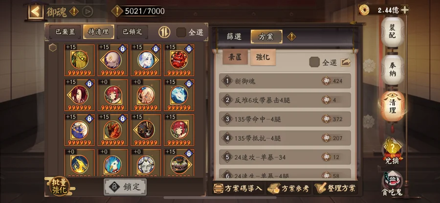 日常活動皆已配好隊伍,御魂整理命名清楚一目了然,高練度多滿級御魂,也有搭配好的棄置+強化方案配隊更自由!