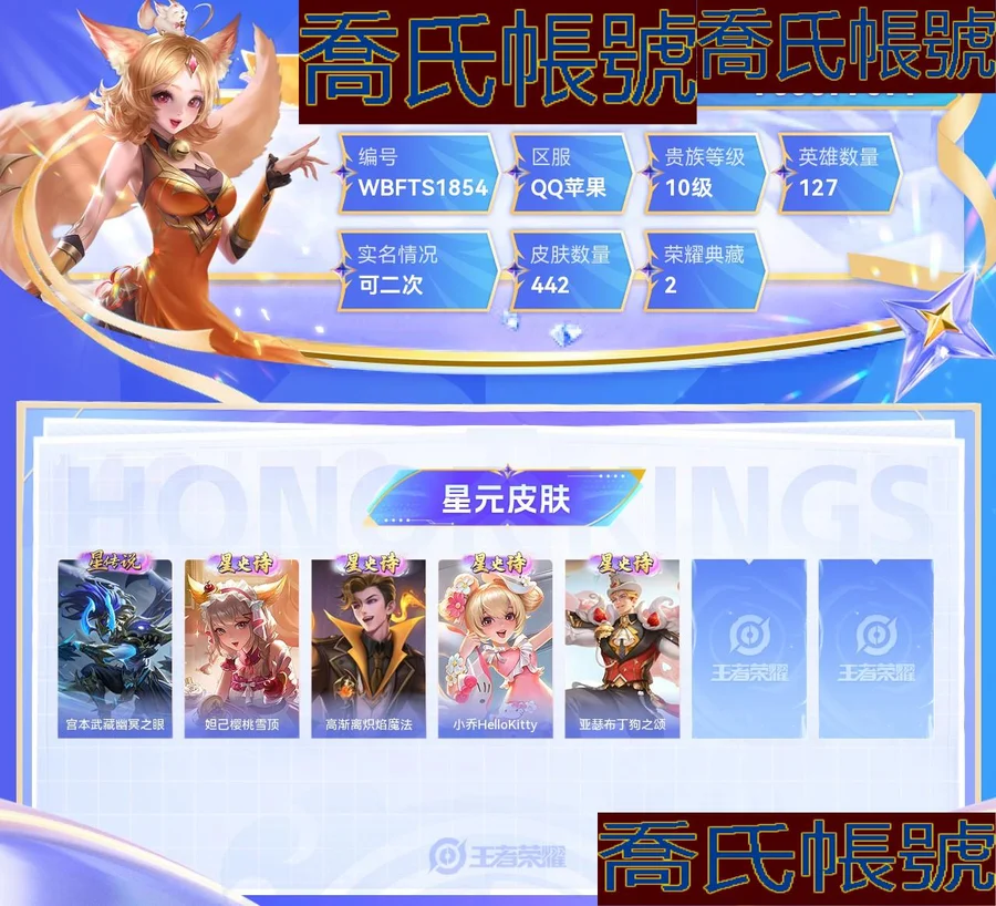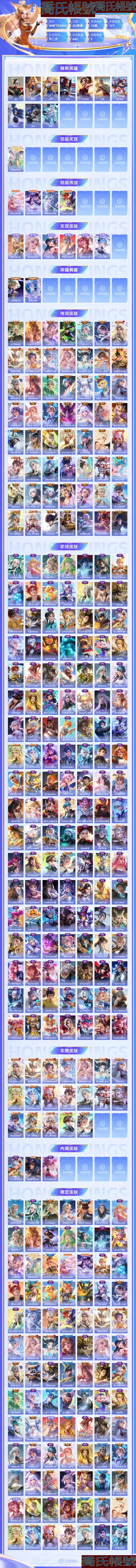 【OBWBFTS185442】 珍品無雙1 珍品傳說4 無雙6 典藏2 星元5 傳說56 史詩126 限定176 榮耀水晶2 英雄127 皮膚442 稀有英雄10 貴族10級 總場次9875 皮膚價值:369044 【珍品無雙1】 貂蟬馥夢繁花 【珍品傳說4】 瑤大耳狗之夢 安琪拉酷洛米之心 嫦娥器靈落星盞 孫策時之奇旅 【無雙皮膚6】 曜器靈螭龍劍 甄姬雪境奇遇 瑤真我赫茲 不知火舞花合鬥 妲己青丘九尾 小喬時之魔女 【榮耀典藏2】 鎧銀白詠嘆調 貂蟬幻闕歌 【星元皮膚5】 宮本武藏幽冥之眼 妲己櫻桃雪頂 高漸離熾焰魔法 小喬HelloKitty 亞瑟布丁狗之頌 【傳說皮膚56】 后羿神樹通天 干將莫邪千山共赴 艾琳覓芳蹤 孫尚香末日機甲 公孫離雲諾千山 楊玉環星之鳴奏 司空震願照山河定 瀾願照九州拓 蔡文姬願照福祿聚 女媧願照千秋盛 虞姬願照歲時盈 妲己願照眾生和 雲纓幻光神槍 裴擒虎祥瑞亨通 嬴政玄雷天君 王昭君映山客 桑啟鳴野蒿 趙雲淬星耀世 孫尚香異界靈契 孫臏小動物樂團 李白鳳求凰 大喬摯愛花嫁 朵莉亞心動手記 雲中君群星魔術團 宮本武藏地獄之眼 王昭君星穹之聲 娜可露露前塵鏡 墨子黃金天蠍座 馬超無雙飛將 狄仁傑神器狴犴令 海月金烏負日 花木蘭冠軍飛將 亞連落雪白狼 貂蟬曦玄引 孫策乘龍淬吳鉤 孫尚香乘龍問璇璣 趙雲乘龍銘鐘鼎 虞姬啟明星使 貂蟬仲夏夜之夢 甄姬至美化雀舞 公孫離祈雪靈祝 瑤時之祈願 鏡熾陽神光 公孫離記憶之芯 西施游龍清影 夏洛特浮生妄 虞姬無限傾心 伽羅熾翼輝光 曜山海蒼雷引 小喬山海琳琅生 李信山海熾霜斬 李白詩劍行 后羿黃金射手座 貂蟬貓影幻舞 不知火舞緋月行 李信一念神魔 【史詩皮膚126】 少司緣巫禮祀神 少司緣塗山紅紅 西施織夢人 公孫離塗山容容 后羿石田雨龍 小喬青蛇 亞瑟布丁狗之誓 百里守約雪豹霜爪 狂鐵龍之律動 劉禪鴨鴨歷險記 阿軻化蝶舞 趙懷真器靈浮夢爐 蒙犽龍鼓爭鳴 馬超神威 諸葛亮黃金分割率 牛魔星界戰將 西施詩語江南 沈夢溪月團寄思 楊玉環遇見飛天 呂布末日機甲 姬小滿妄想食味 艾琳陌上桑 嬴政暗夜貴公子 廉頗地獄巖魂 曹操幽靈船長 劉禪紳士熊喵 蔡文姬夏日便利店 暃埋骨錢 楊戩天秀啟明 羋月浮光幕影 蒙恬榮光聖徽 黃忠怒海爭鋒 瀾賞金獵手 鏡青焰無極 海諾心動手記 呂布聖誕狂歡 公孫離玉兔公主 魯班七號電玩小子 明世隱夜落電臺 安琪拉時之奇旅 司馬懿暗淵魔法 艾琳奇遇舞章 上官婉兒群星魔術團 桑啟奇遇星旅 程咬金功夫廚神 百里玄策熱力迴旋 魯班七號蔬鄉物語 鎧曙光守護者 百里守約特工魅影 大喬乘龍憶丹青 安琪拉乘龍聚寶船 王昭君偶像歌手 高漸離燃音魔法 伽羅琥珀紀元 周瑜雪夜綺願 蒙犽百解令 夏侯惇乘風破浪 夢奇頑趣 司空震地獄燃心 阿古朵江河有靈 嬴政搖滾巨星 西施至美乘鯉謠 孫策貓狗日記 橘右京修羅 妲己時之奇旅 花木蘭水晶獵龍者 扁鵲奇幻香蹤 沈夢溪匿光破解者 宮本武藏鬼劍武藏 劉備百相守夢 甄姬女兒國國王 楊玉環銀翎春語 孫臏天狼運算者 蘭陵王暗隱獵獸者 鏡玫瑰異探 暃星界遊俠 甄姬幽恆 阿軻暗夜貓娘 娜可露露晚螢 馬可波羅山海玄木吟 瑤山海碧波行 元歌無心 鬼谷子五穀豐年 大喬貓狗日記 孫尚香時之戀人 公孫離無限星賞官 劉邦德古拉伯爵 甄姬冰雪圓舞曲 露娜紫霞仙子 金蟬唐三藏 黃忠火炮紳士 蔡文姬舞動綠茵 劉禪天才門將 亞瑟心靈戰警 白起星夜王子 狄仁傑魔術師 韓信傲雪梅槍 瑤遇見神鹿 雅典娜黎明之約 雅典娜冰冠公主 干將莫邪真愛魔法 嫦娥拒霜思 墨子金屬風暴 莊周高山流水 伽羅箭羽風息 阿軻節奏熱浪 妲己女僕咖啡 孫尚香薔薇戀人 百里玄策原初追逐者 張飛亂世虎臣 趙雲皇家上將 李白千年之狐 花木蘭默契交鋒 雲中君纖雲弄巧 裴擒虎李小龍 李元芳逐浪之夏 趙雲未來紀元 蔡文姬繁星吟遊 狄仁傑鷹眼統帥 小喬繽紛獨角獸 典韋藍色畫面警告 孫尚香水果甜心 貂蟬聖誕戀歌 安琪拉心靈駭客 甄姬遊園驚夢 妲己魅力維加斯 【年限皮膚19】 司空震願照山河定 瀾願照九州拓 蔡文姬願照福祿聚 女媧願照千秋盛 虞姬願照歲時盈 妲己願照眾生和 李白鳳求凰 大喬乘龍憶丹青 安琪拉乘龍聚寶船 孫策乘龍淬吳鉤 孫尚香乘龍問璇璣 趙雲乘龍銘鐘鼎 公孫離祈雪靈祝 甄姬幽恆 曜山海蒼雷引 小喬山海琳琅生 李信山海熾霜斬 馬可波羅山海玄木吟 瑤山海碧波行 【內測皮膚3】 姬小滿妄想食味 高漸離玩趣惡龍 孫尚香薔薇戀人 【限定皮膚176】 亞瑟榮光之誓 少司緣巫禮祀神 后羿神樹通天 艾琳鶴鳴心箋 哪吒羅小黑戰記 張良羅小黑戰記 少司緣塗山紅紅 西施織夢人 干將莫邪千山共赴 鬼谷子克喵 公孫離塗山容容 甄姬逆浪荇歌 后羿石田雨龍 姬小滿小滿鴨 艾琳覓芳蹤 貂蟬馥夢繁花 阿古朵布丁狗之約 瑤大耳狗之夢 安琪拉酷洛米之心 亞瑟布丁狗之誓 百里守約雪豹霜爪 狂鐵龍之律動 蘇烈春野閒蹤 劉禪鴨鴨歷險記 沈夢溪鴨鴨歷險記 鍾馗虛靈犬護 阿軻化蝶舞 楊玉環星之鳴奏 趙懷真器靈浮夢爐 嫦娥器靈落星盞 曜器靈螭龍劍 孫策時之奇旅 司空震願照山河定 瀾願照九州拓 蔡文姬願照福祿聚 女媧願照千秋盛 虞姬願照歲時盈 妲己願照眾生和 西施雪境奇遇 馬超神威 甄姬雪境奇遇 瑤真我赫茲 嬴政玄雷天君 太乙真人謐流熔爐 牛魔星界戰將 呂布逐霄戰戟 王昭君映山客 楊玉環遇見飛天 姬小滿妄想食味 桑啟鳴野蒿 艾琳陌上桑