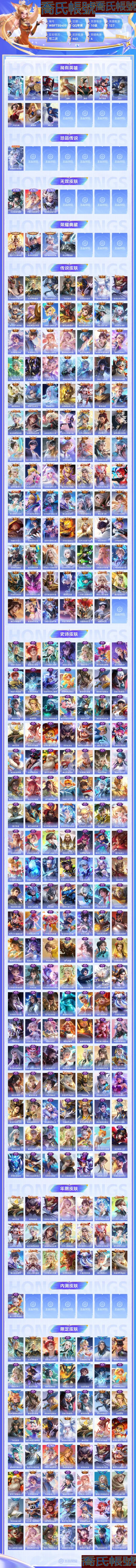 【OBWBFTS540042】 珍品傳說1 無雙3 典藏4 傳說90 史詩140 限定173 英雄127 皮膚443 稀有英雄10 貴族10級 總場次4382 皮膚價值:465528 【珍品傳說1】 嫦娥器靈落星盞 【無雙皮膚3】 公孫離離恨煙 不知火舞花合鬥 韓信群星魔術團 【榮耀典藏4】 花木蘭九霄神輝 韓信弒槍獵影 伽羅最初的交響 李白鳴劍曳影 【傳說皮膚90】 干將莫邪久勝戰神 后羿神樹通天 夏侯惇霜北刀 關羽武聖 后羿無盡星芒 孫尚香異界靈契 百里玄策白虎志 李元芳飛鳶探春 張良黃金白羊座 孫臏小動物樂團 典韋戰鼓燎原 蔡文姬花朝如約 馬超無雙飛將 西施游龍清影 大喬摯愛花嫁 孫策摯愛之約 朵莉亞心動手記 虞姬願照歲時盈 趙雲淬星耀世 孫尚香乘龍問璇璣 虞姬無限傾心 桑啟鳴野蒿 呂布天魔繚亂 艾琳覓芳蹤 虞姬啟明星使 武則天海洋之心 李信一念神魔 夢奇胖達榮榮 鏡熾陽神光 百里守約碎雲 露娜霜月吟 達摩黃金獅子座 公孫離祈雪靈祝 曜李逍遙 亞瑟追逃遊戲 趙雲乘龍銘鐘鼎 裴擒虎寅虎赤拳 孫悟空齊天大聖 花木蘭燃星之曲 小喬山海琳琅生 呂布曦玄引 諸葛亮鶴羽星尊 甄姬至美化雀舞 狄仁傑夜禮服假面 狄仁傑神器狴犴令 項羽無限傾心 娜可露露前塵鏡 雲纓鶴歸松棲 亞連落雪白狼 伽羅熾翼輝光 王昭君永恆水手月亮 王昭君星穹之聲 墨子黃金天蠍座 司空震願照山河定 孫策乘龍淬吳鉤 安琪拉追逃遊戲 妲己願照眾生和 馬可波羅妄想實況 馬可波羅深海之息 曜山海蒼雷引 干將莫邪畫中仙 曜雲鷹飛將 雲纓幻光神槍 劉備時之戀人 周瑜音你心動 貂蟬仲夏夜之夢 孫悟空地獄火 花木蘭冠軍飛將 李白詩劍行 小喬音你心動 呂布怒海麟威 張飛百相守夢 東皇太一灼幽烈陽 公孫離記憶之芯 孫尚香末日機甲 王昭君乞巧織情 雲中君群星魔術團 孫策末日機甲 宮本武藏地獄之眼 后羿黃金射手座 瀾逐花歸海 上官婉兒妄想奇談 李信山海熾霜斬 海月金烏負日 橘右京楓霜盡 夏洛特浮生妄 蘭陵王影龍天霄 不知火舞緋月行 馬超琥珀紀元 鎧琥珀紀元 【史詩皮膚140】 女媧萬靈啟世 狂鐵龍之律動 少司緣巫禮祀神 扁鵲靈蠱蝕心 西施織夢人 蔡文姬舞動綠茵 黃忠百相守夢 楊戩天秀啟明 后羿石田雨龍 百里守約特工魅影 劉禪鴨鴨歷險記 蒙恬榮光聖徽 明世隱吟遊魔法 蘭陵王馴魔獵人 蒙犽頑巖魄 暃埋骨錢 蘭陵王暗隱獵獸者 蔡文姬夏日便利店 韓信白龍吟 萊西奧末日機甲 嬴政搖滾巨星 典韋岱宗 羋月浮光幕影 安琪拉魔法小廚娘 蘇烈玄武志 魯班七號獅舞東方 哪吒雪上飛焰 安琪拉心靈駭客 黃忠怒海爭鋒 呂布聖誕狂歡 老夫子聖誕老人 桑啟奇遇星旅 弈星滕王閣序 瑤遇見神鹿 海諾心動手記 魯班七號蔬鄉物語 妲己女僕咖啡 娜可露露晚螢 劉禪天才門將 劉禪紳士熊喵 伽羅琥珀紀元 金蟬唐三藏 墨子降魔 墨子金屬風暴 宮本武藏鬼劍武藏 安琪拉乘龍聚寶船 安琪拉時之奇旅 瀾賞金獵手 妲己時之奇旅 艾琳奇遇舞章 米萊狄完美假期 馬可波羅山海玄木吟 項羽蒼穹之光 阿軻暗夜貓娘 魯班七號電玩小子 墨子龍騎士 孫尚香水果甜心 鍾馗樂園奇幻夜 花木蘭默契交鋒 百里玄策超元獵域 劉備百相守夢 阿軻化蝶舞 黃忠烈魂 周瑜雪夜綺願 亞瑟心靈戰警 趙雲龍膽 趙雲引擎之心 趙雲未來紀元 關羽百相守夢 孫悟空孫行者 花木蘭水晶獵龍者 公孫離蜜橘之夏 小喬繽紛獨角獸 李元芳逐浪之夏 羋月白晶晶 呂布末日機甲 程咬金功夫廚神 甄姬女兒國國王 甄姬冰雪圓舞曲 阿古朵頑趣 張飛虎魄 西施至美乘鯉謠 西施詩語江南 公孫離玉兔公主 公孫離無限星賞官 大喬白蛇 干將莫邪冰霜戀舞曲 大喬乘龍憶丹青 鎧曙光守護者 楊玉環銀翎春語 露娜紫霞仙子 劉邦德古拉伯爵 李白千年之狐 張飛亂世虎臣 曹操幽靈船長 夏侯惇乘風破浪 豬八戒豬悟能 牛魔奔雷神使 元歌無心 上官婉兒群星魔術團 嫦娥拒霜思 蒙犽百解令 廉頗地獄巖魂 妲己魅力維加斯 明世隱夜落電臺 司馬懿暗淵魔法 沈夢溪匿光破解者 白起星夜王子 瑤山海碧波行 趙懷真器靈浮夢爐 趙懷真鶴歸松棲 孫臏天狼運算者 橘右京修羅 夏洛特永晝 不知火舞魅語 百里守約朱雀志 馬超神威 雲中君纖雲弄巧 王昭君偶像歌手 楊玉環遇見飛天 雅典娜黎明之約 雅典娜冰冠公主 牛魔星界戰將 典韋藍色畫面警告 高漸離燃音魔法 扁鵲奇幻香蹤 鏡青焰無極 嬴政白晝王子 暃星界遊俠 孫臏茶境仙 姬小滿妄想食味 百里玄策熱力迴旋 趙雲皇家上將 關羽冰鋒戰神 老夫子航海奇遇記 孫悟空至尊寶 狄仁傑鷹眼統帥 狄仁傑魔術師 莊周高山流水 莊周雲端築夢師 【年限皮膚21】 典韋岱宗 蘇烈玄武志 百里玄策白虎志 虞姬願照歲時盈 孫尚香乘龍問璇璣 安琪拉乘龍聚寶船 馬可波羅山海玄木吟 公孫離祈雪靈祝 趙雲乘龍銘鐘鼎 裴擒虎寅虎赤拳 小喬山海琳琅生 司空震願照山河定 孫策乘龍淬吳鉤 妲己願照眾生和 曜山海蒼雷引 李信山海熾霜斬 大喬乘龍憶丹青 孫悟空美猴王 牛魔奔雷神使 瑤山海碧波行 百里守約朱雀志 【內測皮膚1】 姬小滿妄想食味 【限定皮膚173】 女媧萬靈啟世 后羿神樹通天 狂鐵龍之律動 少司緣巫禮祀神 艾琳鶴鳴心箋 張良羅小黑戰記 哪吒羅小黑戰記 西施織夢人 鬼谷子克喵 甄姬逆浪荇歌 鍾馗虛靈犬護 白起死霸裝 后羿石田雨龍 劉禪鴨鴨歷險記 沈夢溪鴨鴨歷險記 蒙恬榮光聖徽 明世隱吟遊魔法 蘭陵王馴魔獵人 蒙犽頑巖魄 夏侯惇霜