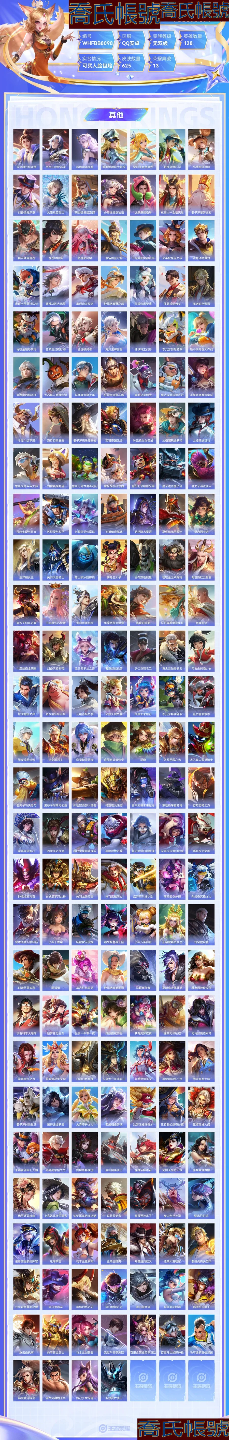 【OBWHFBB809842】 珍品無雙1 珍品傳說5 無雙6 典藏13 傳說104 史詩221 限定291 英雄128 皮膚625 稀有英雄11 貴族無雙級 總場次9074 皮膚價值:773874 【珍品無雙1】 貂蟬馥夢繁花 【珍品傳說5】 安琪拉酷洛米之心 瑤大耳狗之夢 張飛兔猻蓬尾 馬可波羅怪盜基德 魯班七號江戶川柯南 【無雙皮膚6】 鎧神罪 曜器靈螭龍劍 甄姬雪境奇遇 武則天神器明輝儀 公孫離離恨煙 李白碎月劍心 【榮耀典藏13】 虞姬神鑑啟示錄 關羽赤影疾鋒 伽羅最初的交響 瑤拾光映像 花木蘭九霄神輝 韓信弒槍獵影 貂蟬幻闕歌 孫悟空全息碎影 諸葛亮星域神啟 孫尚香殺手不太冷 李白鳴劍曳影 小喬天鵝之夢 武則天倪克斯神諭 【傳說皮膚104】 后羿神樹通天 司馬懿九山相柳 楊戩永曜之星 公孫離雲諾千山 西施續相思 楊玉環星之鳴奏 裴擒虎祥瑞亨通 女媧願照千秋盛 司空震願照山河定 虞姬願照歲時盈 蔡文姬願照福祿聚 妲己願照眾生和 瀾願照九州拓 雲纓幻光神槍 王昭君映山客 桑啟鳴野蒿 莊周牧神詩旅 鎧絳天戰甲 鎧冥王哈迪斯 夏侯惇霜北刀 海月金烏負日 亞連落雪白狼 呂布曦玄引 貂蟬曦玄引 趙雲乘龍銘鐘鼎 孫策乘龍淬吳鉤 孫尚香乘龍問璇璣 艾琳覓芳蹤 瀾逐花歸海 露娜霜月吟 狄仁傑夜禮服假面 王昭君永恆水手月亮 甄姬至美化雀舞 魯班七號時之奇旅 大喬時之奇旅 蘭陵王影龍天霄 呂布遇見神鼓 宮本武藏驚梅引 上官婉兒妄想奇談 馬可波羅妄想實況 東皇太一灼幽烈陽 諸葛亮鶴羽星尊 夏洛特浮生妄 干將莫邪畫中仙 花木蘭燃星之曲 伽羅熾翼輝光 小喬山海琳琅生 曜山海蒼雷引 李信山海熾霜斬 孫悟空齊天大聖 李白詩劍行 狄仁傑神器狴犴令 不知火舞緋月行 王昭君星穹之聲 百里守約碎雲 李元芳飛鳶探春 橘右京楓霜盡 娜可露露前塵鏡 馬可波羅深海之息 馬超無雙飛將 孫策摯愛之約 大喬摯愛花嫁 諸葛亮武陵仙君 露娜啟示之音 瑤時之祈願 女媧補天 趙雲淬星耀世 王昭君乞巧織情 西施游龍清影 魯班七號寅虎瑞焰 裴擒虎寅虎赤拳 孫尚香異界靈契 貂蟬遇見胡旋 曜李逍遙 周瑜音你心動 小喬音你心動 夢奇胖達榮榮 后羿黃金射手座 蘭陵王默契交鋒 宮本武藏地獄之眼 達摩黃金獅子座 諸葛亮時雨天司 公孫離祈雪靈祝 鏡熾陽神光 虞姬啟明星使 孫悟空零號赤焰 孫悟空地獄火 百里玄策白虎志 關羽武聖 曜雲鷹飛將 李信一念神魔 張良黃金白羊座 劉備時之戀人 呂布天魔繚亂 貂蟬仲夏夜之夢 干將莫邪久勝戰神 狄仁傑超時空戰士 貂蟬貓影幻舞 武則天海洋之心 花木蘭冠軍飛將 虞姬雲霓雀翎 孫尚香末日機甲 伽羅太華 李白鳳求凰 【史詩皮膚221】 牛魔星界戰將 少司緣巫禮祀神 張良千籌問戰 女媧萬靈啟世 蘭陵王儺神司 萊西奧光弋星穹 公孫離塗山容容 西施織夢人 黃忠百相守夢 后羿輝光之辰 朵莉亞幻珠鮫人 雲纓贊萌露比 鍾無豔戍鼓銘心 萊西奧末日機甲 鏡青焰無極 周瑜百相守夢 后羿石田雨龍 牛魔小牛鴨 關羽百相守夢 亞瑟布丁狗之誓 雅典娜黎明之約 老夫子藏狐褐絨 扁鵲靈蠱蝕心 百里守約雪豹霜爪 狂鐵龍之律動 劉禪鴨鴨歷險記 孫臏茶境仙 阿軻化蝶舞 羋月瑰影綺夢 狄仁傑綺世丹青 蒼狼魂孤將 亞連糖繪人間 趙懷真器靈浮夢爐 姬小滿妄想食味 艾琳陌上桑 亞連破空之劍 米萊狄完美假期 弈星滕王閣序 暃埋骨錢 蘭陵王馴魔獵人 曹操天狼征服者 哪吒雪上飛焰 阿古朵頑趣 楊戩天秀啟明 蒙犽龍鼓爭鳴 安琪拉時之奇旅 莊周天秀幻夢 小喬青蛇 趙雲百木心槍 司空震地獄燃心 姬小滿戰舞者 蔡文姬夏日便利店 少司緣塗山紅紅 大司命東方月初 干將莫邪真愛魔法 鍾馗樂園奇幻夜 魯班七號蔬鄉物語 曹操夜都魔契 大喬白蛇 百里玄策超元獵域 夏洛特永晝 安琪拉乘龍聚寶船 大喬乘龍憶丹青 伽羅琥珀紀元 高漸離燃音魔法 周瑜雪夜綺願 蒙犽百解令 阿古朵江河有靈 西施至美乘鯉謠 貂蟬逐夢之音 貂蟬喚靈魅影 李元芳匿光偵查者 戈婭馭風魔法 趙雲引擎之心 豬八戒豬悟能 劉禪電玩爆裂旋風 扁鵲奇幻香蹤 沈夢溪匿光破解者 莊周雲端築夢師 鏡玫瑰異探 夢奇頑趣 暃星界遊俠 莊周玄嵩 瑤山海碧波行 馬可波羅山海玄木吟 甄姬幽恆 元歌無心 上官婉兒神器永珍筆 鍾無豔超時空戰士 趙雲嘻哈天王 盾山夢圓繁星 鬼谷子五穀豐年 妲己時之奇旅 裴擒虎天狼狩獵者 老夫子航海奇遇記 狂鐵電玩高手 魯班大師匿光啟智者 妲己熱情桑巴 花木蘭瑞麟志 蘇烈玄武志 金蟬唐三藏 沈夢溪月團寄思 高漸離天秀音浪 明世隱吟遊魔法 宮本武藏鬼劍武藏 百里玄策原初追逐者 艾琳奇遇舞章 雲中君時之祈願 瀾賞金獵手 公孫離玉兔公主 黃忠火炮紳士 露娜一生所愛 瑤遇見神鹿 孫臏寅虎展翼 嫦娥如夢令 楊玉環寅虎心曲 韓信傲雪梅槍 夏侯惇乘風破浪 花木蘭青春決賽季 鏡匿光追影者 甄姬女兒國國王 嫦娥拒霜思 司馬懿暗淵魔法 莊周高山流水 鎧青龍志 楊玉環遇見飛天 孫悟空孫行者 公孫離蜜橘之夏 嬴政優雅戀人 韓信逐夢之影 魯班七號乒乒小將 劉禪紳士熊喵 大喬白鶴梁神女 伽羅天狼溯光者 米萊狄胡桃異想國 王昭君鳳凰于飛 百里玄策熱力迴旋 馬可波羅逐夢之星 關羽冰鋒戰神 西施詩語江南 廉頗地獄巖魂 東皇太一逐夢之光 張飛亂世虎臣 程咬金功夫廚神 鎧曙光守護者 干將莫邪冰霜戀舞曲 花木蘭默契交鋒 孫尚香水果甜心 元歌雲間偶戲 妲己女僕咖啡 劉禪天才門將 