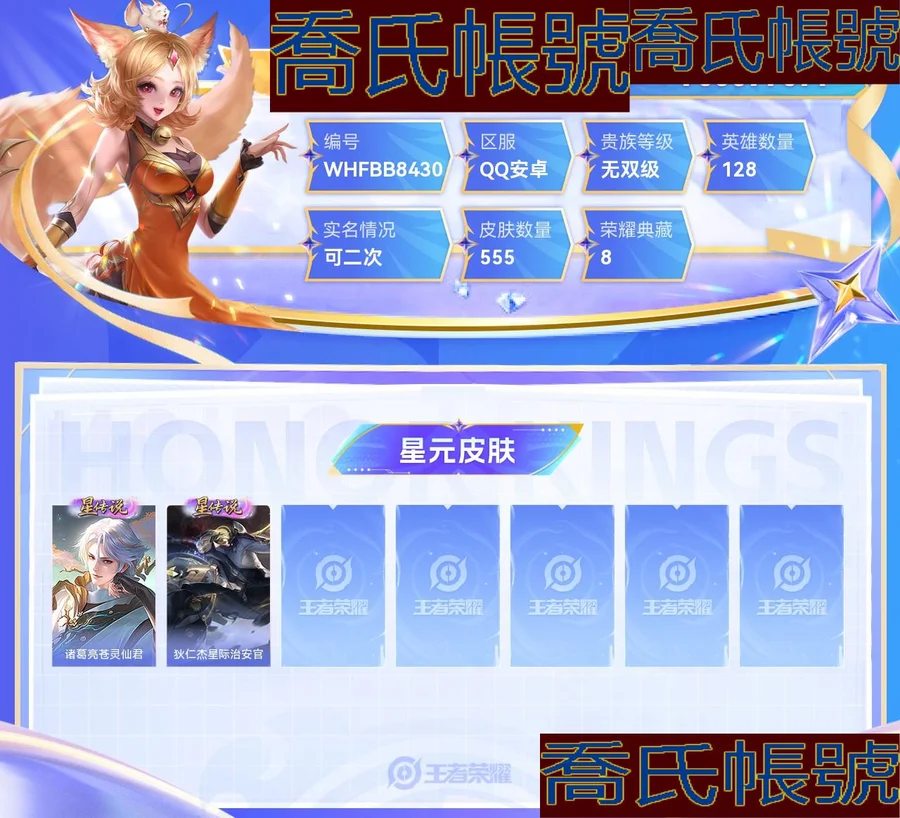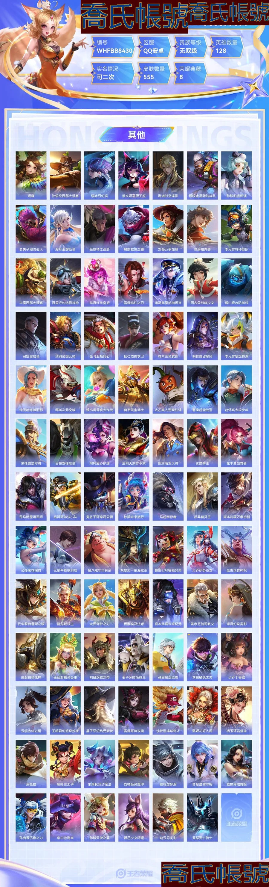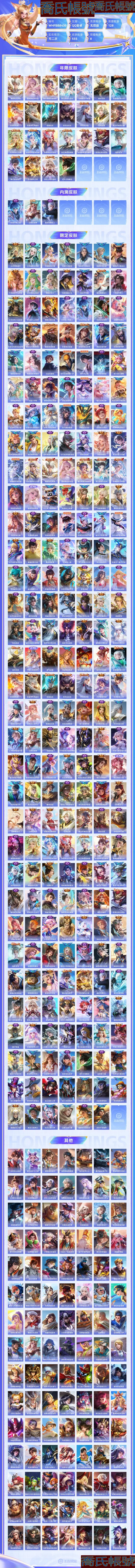 【OBWHFBB843042】 珍品無雙1 珍品傳說9 無雙8 典藏8 星元2 傳說96 史詩186 限定230 榮耀水晶9 英雄128 皮膚555 稀有英雄11 貴族無雙級 總場次7413 皮膚價值:616860 【珍品無雙1】 貂蟬馥夢繁花 【珍品傳說9】 宮本武藏黑崎一護 暃朽木白哉 安琪拉酷洛米之心 瑤大耳狗之夢 張飛兔猻蓬尾 嫦娥器靈落星盞 孫策時之奇旅 魯班七號江戶川柯南 馬可波羅怪盜基德 【無雙皮膚8】 甄姬雪境奇遇 公孫離離恨煙 不知火舞花合鬥 韓信群星魔術團 妲己青丘九尾 小喬時之魔女 李白碎月劍心 武則天神器明輝儀 【榮耀典藏8】 孫悟空全息碎影 瑤拾光映像 羋月大秦宣太後 虞姬神鑑啟示錄 李白鳴劍曳影 貂蟬幻闕歌 鎧銀白詠嘆調 武則天倪克斯神諭 【星元皮膚2】 諸葛亮蒼靈仙君 狄仁傑星際治安官 【傳說皮膚96】 周瑜音你心動 后羿神樹通天 干將莫邪千山共赴 元歌詭秘之主 大司命死亡執政官 司馬懿九山相柳 楊戩永曜之星 魯班七號寅虎瑞焰 裴擒虎寅虎赤拳 夢奇胖達榮榮 干將莫邪久勝戰神 百里守約碎雲 公孫離雲諾千山 裴擒虎祥瑞亨通 西施續相思 楊玉環星之鳴奏 司空震願照山河定 瀾願照九州拓 虞姬願照歲時盈 蔡文姬願照福祿聚 妲己願照眾生和 女媧願照千秋盛 雲纓幻光神槍 嬴政玄雷天君 王昭君映山客 馬可波羅妄想實況 桑啟鳴野蒿 貂蟬仲夏夜之夢 鏡熾陽神光 夏侯惇霜北刀 孫尚香末日機甲 孫策末日機甲 伽羅熾翼輝光 關羽武聖 鎧冥王哈迪斯 后羿無盡星芒 孫尚香異界靈契 諸葛亮時雨天司 劉備時之戀人 李白鳳求凰 大喬摯愛花嫁 孫策摯愛之約 朵莉亞心動手記 雲中君群星魔術團 李信一念神魔 小喬音你心動 呂布天魔繚亂 娜可露露前塵鏡 蔡文姬花朝如約 墨子黃金天蠍座 張良黃金白羊座 達摩黃金獅子座 狄仁傑超時空戰士 亞連落雪白狼 李元芳飛鳶探春 橘右京楓霜盡 鎧絳天戰甲 后羿黃金射手座 海月金烏負日 孫臏小動物樂團 曜李逍遙 呂布曦玄引 貂蟬曦玄引 艾琳覓芳蹤 諸葛亮武陵仙君 西施游龍清影 虞姬雲霓雀翎 孫策乘龍淬吳鉤 趙雲乘龍銘鐘鼎 孫尚香乘龍問璇璣 女媧補天 瀾逐花歸海 甄姬至美化雀舞 百里玄策白虎志 呂布遇見神鼓 大喬時之奇旅 宮本武藏驚梅引 雲纓鶴歸松棲 伽羅太華 諸葛亮鶴羽星尊 趙雲淬星耀世 夏洛特浮生妄 曜山海蒼雷引 狄仁傑神器狴犴令 李信山海熾霜斬 宮本武藏地獄之眼 虞姬啟明星使 李白詩劍行 王昭君星穹之聲 不知火舞緋月行 武則天海洋之心 孫尚香音你閃耀 花木蘭冠軍飛將 馬超無雙飛將 曜雲鷹飛將 露娜啟示之音 【史詩皮膚186】 阿古朵頑趣 少司緣巫禮祀神 女媧萬靈啟世 公孫離塗山容容 西施織夢人 瑤山海碧波行 弈星守夜人 朵莉亞幻珠鮫人 黃忠百相守夢 弈星萬物之道 元歌雲間偶戲 雲纓贊萌露比 百里玄策原初追逐者 鍾無豔戍鼓銘心 廉頗寅虎御盾 孫臏寅虎展翼 周瑜百相守夢 西施至美乘鯉謠 后羿石田雨龍 牛魔小牛鴨 蒙犽狂想玩偶喵 關羽百相守夢 亞瑟布丁狗之誓 扁鵲靈蠱蝕心 百里守約雪豹霜爪 老夫子藏狐褐絨 狂鐵龍之律動 劉禪鴨鴨歷險記 萊西奧末日機甲 羋月瑰影綺夢 狄仁傑綺世丹青 亞連糖繪人間 蒼狼魂孤將 趙懷真器靈浮夢爐 馬可波羅暗影遊獵 阿軻化蝶舞 蒙犽龍鼓爭鳴 鎧曙光守護者 白起蒼鱗隱世 孫臏茶境仙 牛魔星界戰將 百里守約百相守夢 沈夢溪月團寄思 裴擒虎李小龍 花木蘭水晶獵龍者 安琪拉心靈駭客 艾琳陌上桑 李元芳銀河之約 李白謫仙醉月 亞連破空之劍 弈星熾弈燎原 孫策貓狗日記 夢奇頑趣 大喬貓狗日記 大司命東方月初 少司緣塗山紅紅 大喬白鶴梁神女 蒙犽頑巖魄 趙雲百木心槍 暃埋骨錢 蔡文姬夏日便利店 典韋岱宗 張飛虎魄 安琪拉魔法小廚娘 羋月浮光幕影 王昭君鳳凰于飛 百里守約朱雀志 鎧青龍志 蘇烈玄武志 楊戩天秀啟明 西施詩語江南 黃忠怒海爭鋒 海諾心動手記 明世隱夜落電臺 鏡青焰無極 韓信白龍吟 鍾馗樂園奇幻夜 鏡玫瑰異探 夏洛特永晝 姜子牙閒日漁趣 豬八戒豬悟能 公孫離玉兔公主 娜可露露晚螢 馬超神威 孫尚香時之戀人 艾琳奇遇舞章 貂蟬喚靈魅影 司馬懿暗淵魔法 橘右京修羅 不知火舞魅語 公孫離無限星賞官 狄仁傑鷹眼統帥 干將莫邪冰霜戀舞曲 小喬青蛇 上官婉兒群星魔術團 露娜紫霞仙子 夏侯惇匿光決鋒者 公孫離蜜橘之夏 百里玄策超元獵域 桑啟奇遇星旅 嬴政暗夜貴公子 哪吒雪上飛焰 魯班七號蔬鄉物語 海月浮夢羅煙 莊周玄嵩 楊玉環寅虎心曲 蔡文姬舞動綠茵 黃忠烈魂 孫悟空孫行者 伽羅箭羽風息 曹操夜都魔契 大喬乘龍憶丹青 安琪拉乘龍聚寶船 大喬白蛇 雅典娜黎明之約 伽羅琥珀紀元 諸葛亮黃金分割率 亞瑟心靈戰警 高漸離燃音魔法 哪吒逐夢之翼 蒙恬榮光聖徽 雲中君纖雲弄巧 周瑜雪夜綺願 嫦娥拒霜思 蒙犽百解令 百里守約特工魅影 司空震地獄燃心 廉頗地獄巖魂 阿古朵江河有靈 貂蟬聖誕戀歌 劉禪紳士熊喵 戈婭馭風魔法 嬴政搖滾巨星 米萊狄完美假期 劉禪電玩爆裂旋風 沈夢溪匿光破解者 扁鵲奇幻香蹤 呂布聖誕狂歡 楊玉環銀翎春語 蘭陵王暗隱獵獸者 墨子金屬風暴 程咬金功夫廚神 項羽蒼穹之光 妲己女僕咖啡 小喬繽紛獨角獸 后羿輝光之辰 嬴政優雅戀人 盤古冰霜神祇 瀾賞金獵手 呂布末日機甲 暃星界遊俠 曹操幽靈船長 趙雲未來紀元 魯班七號電玩小子 劉禪天才門將 李元芳逐浪之夏 劉邦德古拉伯爵 