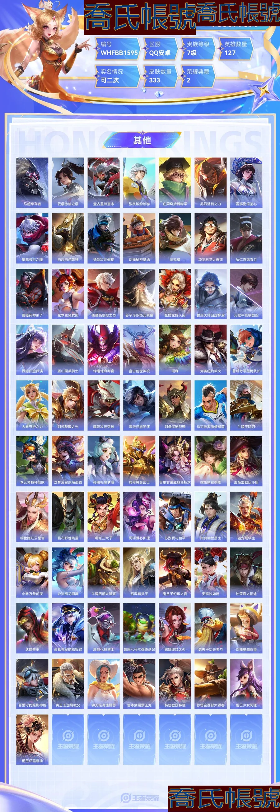【OBWHFBB159542】 典藏2 星元2 傳說8 史詩98 限定109 英雄127 皮膚333 稀有英雄10 貴族7級 總場次13121 皮膚價值:250958 【榮耀典藏2】 李白鳴劍曳影 孫悟空全息碎影 【星元皮膚2】 宮本武藏幽冥之眼 孫悟空幽冥火 【傳說皮膚8】 宮本武藏地獄之眼 后羿神樹通天 瀾願照九州拓 干將莫邪久勝戰神 諸葛亮時雨天司 達摩黃金獅子座 孫尚香末日機甲 孫悟空地獄火 【史詩皮膚98】 少司緣巫禮祀神 弈星萬物之道 女媧萬靈啟世 百里玄策羅小黑戰記 不知火舞魅語 孫悟空至尊寶 公孫離塗山容容 扁鵲靈蠱蝕心 黃忠百相守夢 劉禪紳士熊喵 司馬懿暗淵魔法 趙懷真器靈浮夢爐 牛魔星界戰將 沈夢溪月團寄思 阿軻節奏熱浪 鎧曙光守護者 伽羅箭羽風息 張飛亂世虎臣 高漸離燃音魔法 姬小滿妄想食味 呂布聖誕狂歡 蒙恬榮光聖徽 蒙犽百解令 百里守約特工魅影 大喬貓狗日記 阿古朵江河有靈 項羽蒼穹之光 趙雲引擎之心 劉禪電玩爆裂旋風 扁鵲奇幻香蹤 夢奇頑趣 廉頗地獄巖魂 暃星界遊俠 呂布末日機甲 元歌無心 鍾無豔超時空戰士 甄姬冰雪圓舞曲 鬼谷子五穀豐年 嬴政優雅戀人 狂鐵電玩高手 明世隱吟遊魔法 蔡文姬舞動綠茵 黃忠火炮紳士 亞瑟心靈戰警 曹操幽靈船長 露娜紫霞仙子 劉邦德古拉伯爵 韓信傲雪梅槍 雅典娜黎明之約 花木蘭水晶獵龍者 嫦娥拒霜思 干將莫邪真愛魔法 阿軻暗夜貓娘 莊周高山流水 甄姬遊園驚夢 馬可波羅暗影遊獵 程咬金功夫廚神 雅典娜冰冠公主 老夫子航海奇遇記 孫尚香薔薇戀人 韓信逐夢之影 妲己女僕咖啡 米萊狄胡桃異想國 白起星夜王子 魯班七號電玩小子 呂布御風驍將 小喬繽紛獨角獸 貂蟬聖誕戀歌 安琪拉心靈駭客 元歌雲間偶戲 百里玄策原初追逐者 李白千年之狐 狄仁傑魔術師 雲中君纖雲弄巧 蒙犽狂想玩偶喵 劉禪天才門將 裴擒虎李小龍 墨子金屬風暴 蘭陵王暗隱獵獸者 趙雲未來紀元 李元芳銀河之約 后羿如夢令 李元芳逐浪之夏 諸葛亮黃金分割率 狄仁傑鷹眼統帥 蘭陵王馴魔獵人 蔡文姬繁星吟遊 上官婉兒梁祝 嬴政搖滾巨星 夏侯惇乘風破浪 王昭君偶像歌手 孫尚香水果甜心 趙雲皇家上將 韓信白龍吟 宮本武藏鬼劍武藏 楊玉環遇見飛天 鍾無豔王者之錘 孫策貓狗日記 【年限皮膚3】 瀾願照九州拓 呂布御風驍將 諸葛亮時雨天司 【內測皮膚4】 弈星萬物之道 姬小滿妄想食味 嬴政優雅戀人 孫尚香薔薇戀人 【限定皮膚109】 少司緣巫禮祀神 后羿神樹通天 弈星萬物之道 艾琳鶴鳴心箋 女媧萬靈啟世 百里玄策羅小黑戰記 張良羅小黑戰記 哪吒羅小黑戰記 孫悟空至尊寶 公孫離塗山容容 鬼谷子克喵 蘇烈春野閒蹤 趙懷真器靈浮夢爐 瀾願照九州拓 太乙真人謐流熔爐 西施雪境奇遇 牛魔星界戰將 盤古敬我三分 姜子牙天穹之誓 劉邦劍破天穹 沈夢溪龍舞盛年 妲己靈卜魔法 高漸離燃音魔法 姬小滿妄想食味 鬼谷子天穹祈燈 蒙恬榮光聖徽 蒙犽百解令 阿古朵江河有靈 張良古海尋蹤 趙雲引擎之心 魯班大師探海日誌 扁鵲奇幻香蹤 楊戩潮玩騎兵 夢奇頑趣 裴擒虎擒濤扼浪 暃星界遊俠 嫦娥暖冬兔眠 桑啟海鹽詩旅 元歌無心 鍾無豔超時空戰士 鬼谷子五穀豐年 甄姬落雪蘭心 李元芳雲中旅人 嬴政優雅戀人 狂鐵電玩高手 王昭君午後時光 沈夢溪大漠名商 白起夜都怪俠 明世隱吟遊魔法 蘭陵王金庭之子 黃忠火炮紳士 韓信傲雪梅槍 羋月幻夜卜夢 達摩沙漠行僧 雅典娜黎明之約 嫦娥拒霜思 后羿聖弓遊俠 干將莫邪真愛魔法 莊周高山流水 甄姬遊園驚夢 蘇烈千軍破陣 馬可波羅暗影遊獵 老夫子航海奇遇記 孫尚香薔薇戀人 韓信逐夢之影 鍾馗驅儺正儀 墨子神蹟守衛 米萊狄胡桃異想國 達摩星際陸戰隊 太乙真人華麗搖滾 程咬金演武奪籌 呂布御風驍將 元歌雲間偶戲 亞瑟潮玩騎士王 百里玄策原初追逐者 諸葛亮時雨天司 高漸離死亡搖滾 狄仁傑萬華元夜 狄仁傑魔術師 雲中君纖雲弄巧 蒙犽狂想玩偶喵 裴擒虎李小龍 雅典娜單詞大作戰 鬼谷子原初探秘者 老夫子醍醐杖 明世隱疑決卦 李元芳銀河之約 后羿如夢令 弈星混沌棋 沈夢溪星空之諾 蘭陵王馴魔獵人 蔡文姬繁星吟遊 周瑜赤蓮之焰 夏侯惇朔風刀 上官婉兒梁祝 盾山御鑾 牛魔御旌 米萊狄御霄 趙雲皇家上將 楊玉環遇見飛天 狂鐵御獅 鍾無豔王者之錘 典韋窮奇 羋月重明 狄仁傑陰陽師 項羽海灘派對 曹操燭龍 太乙真人饕餮 白起猙 【其他169】 萊西奧西部遊俠 大司命暗都幽影 孫權徑山謀武 程咬金星際陸戰隊 萊西奧踏浪烽翎 雲中君雲械藍圖 莊周錦麟遊夢 李白範海辛 宮本武藏永珍初新 張良靈野札記 劉備浪漫序章 戈婭玫藍誓約 姜子牙星夢巡禮 明世隱景韶洛都 姜子牙時尚教父 達摩爆裂喵拳 海月幻泉霧影 蒼蒼林狼騎 干將莫邪第七人偶 干將莫邪霧都夜雨 武則天東方不敗 伽羅花見巫女 鍾無豔生化警戒 程咬金群星魔術團 李白敏銳之力 李信灼熱之刃 趙雲白執事 蒼維京掠奪者 弈星踏雪尋梅 莊周鯉魚之夢 太乙真人圓桌騎士 桑啟畫中遊 羋月紅桃皇后 米萊狄精準探案法 項羽帝國元帥 張良一千零一夜 狂鐵命運角鬥場 朵莉亞金色潮汐 廉頗功夫炙烤 亞瑟鴻運當頭 鬼谷子阿摩司公爵 海諾時空諜影 后羿完美運算 上官婉兒修竹墨客 鍾無豔聚星閃耀 亞連破局者 海月王牌新星 露娜哥特玫瑰 夢奇美夢成真 李元芳妄想特派 楊戩埃及法老 姬小滿零食大作戰 魯班七號福祿兄弟 