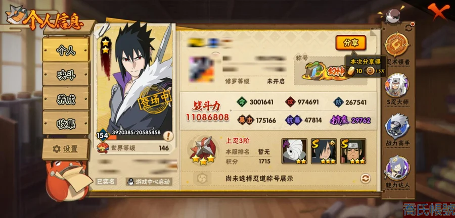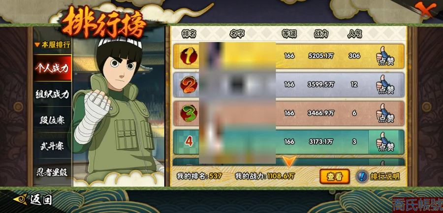 【11等】戰鬥力:1108W+;段位:上忍3階;本服排名:537;戰區排名:未上榜;V