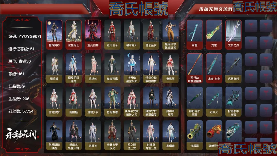 【YJYYOYG967111】9紅206金丨等級161丨青銅3丨金磚14丨幻絲57754丨通行證未升級Lv.51丨紅色神品:星輝魔紗,帝星,龍雀,太玄之刃,西行劫·如意金箍棒,冰魄-長劍,化生明王,墨離,監兵凶神,變身器:洛天依·共鳴,應龍號,攬九天,角色金色皮膚:紅川仙子,碧水青天,崑崙聖女,怪誕狂想·致命玩笑,銀狼裘,倒反陰陽·凜冬,浣煙紗,瀚海蒼鷹,洛天依·星空投影,怦然心動·軟暖甜夢,春桃笑,御宅羅夢,陰陽姬,清雅少女,覺明尊者,決戰平安京·御神之刃,綠野守護·暗沼摩羅,封神錄·敖丙,倒反陰陽·鐵面,新魔傑·斬魔天將,常勝袍,華夏寶甲·漢光,龍之影·過江龍,封神錄·龍吉公主,寒煙素,甜夜安眠·鵝黃紗夢,智繪·萍之緣,蘭庭月,秋藏桂,綠野守護·悠竹萌客,西行劫·悟空,英雄袍,冬無歸,封神錄·哪吒,春不斂,夏日派對·赤夏悠漾,封神錄·妲己,天工奧妙,壽竹雲春,金財聚輝,封神錄·姜子牙,雲間影,赤焰戰靈,綠野守護·山漠獰影,天虹詠,甜蜜心動,鴨舌帽,植物大戰殭屍2·腦子給我,福虎帽,封神錄·驍雄,倒反陰陽·鑑心冠,甜夜安眠·絨熊奶泡,魔燭帽,綠野守護·絨絨貓,觀山海·腓尾,封神錄·傾城,季中賽2025·瀚沙,安樂冠,夜露帽,虹貓藍兔七俠傳·寒月,百戲碗,髮型金色皮膚:逆水寒·江海發,倒反陰陽·銘誓發,(挑染)清威發,觀山海·春暉發,綠野守護·嬌憨發,幽焰發,封神錄·籠煙芍藥發,封神錄·仙風發,鶴姿發,武器金色皮膚:沉默審判,綠野守護·雨幕,石中火,狩獵都市·潛磷,竹霹靂,貔貅吞寶,龍嘯,雲朵咩咩,凝冰魄,心魔,逆逢,財神劍,玉霜龍,亢龍,複製體·月光與黑暗,華夏神兵·永樂寶劍,風神切,數珠丸,靈木角,長虹,委蛇矛,華夏神兵·馬首刀,九霄寒,空寒,破重雲,2674·貳型電漿杖,星輝環月,千鈞羽,麒麟牙,曜金紫珀,倒反陰陽·盡春鋒,白鹿,無相印,綠野守護·毛乎乎,熾意炎拳,天狐,玄銅飛軍,, 【Steam】【國服】小號不玩了可以大砍