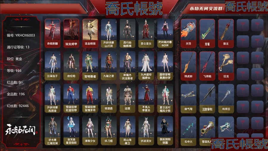 【YJYRHOX600311】9紅196金|等級156|黃金|幻絲92446|金磚0|通行證Lv.13 紅色神品:赤皓新囍,獄炎燼甲,流金曉錦,天罰,龍雀,狼主,悍虎斬,飛將戟,狂龍 角色金色皮膚:開闢鴻蒙·山川潤,西行劫·蜘蛛精,崑崙聖女,P5R·奧村春NOIR,云溪仙子,絕倫袍,覺明尊者,九驪之君,新魔傑·伏龍尊者,九州遺珍·福壽仙,甜夜安眠·鵝黃紗夢,開闢鴻蒙·風雨諧,怪誕狂想·紅藍狂想,怪誕狂想·友情歲月,銀狼裘,追獵,不良人·李星雲,夏日派對·椰風夕照,逆水寒·江海滄瀾,洛天依·星空投影,清雅少女,妖刀姬,觀山海·精衛,伏波龍女,倒反陰陽·鐵面,新魔傑·斬魔天將,一品仙君,朝聞道,祿運玉霄,金襦玉衫,禍津素盞,花之傾奇,倒反陰陽·凜冬,福瑞天澤,冬無歸,武道無窮·八極,春不斂,天工奧妙,雲間影,雪鈴綺歌 髮型金色皮膚:P5R·NOIR髮型發,緣覺發,九州遺珍·春桃發,甜夜安眠·暖絨發,逆水寒·江海發,不良人·三聖涅發,(挑染)水仙發,倒反陰陽·銘誓發,(挑染)羽客發,排霜發,(挑染)忠嘉發,鶴髮,驚雀發,秀逸發,鶴姿發,蜜語發,(挑染)牽雲霞發 武器金色皮膚:御氣弩,沉默審判,戲祥雲,石中火,雪國禮炮,丹鶴,月虹弦角,腥紅之月,玄銅飛軍,鎮惡,2674·原型,不良人·龍泉劍,劫燼·煉,赤霄,華夏神兵·永樂寶劍,壺中日月,毅魂守,倒反陰陽·盡春鋒,納福,無韻,塑夢鑰匙,魚化龍,惡障,聽濤,星輝環月,千鈞羽,斷月影,長虹,建木,糖果棍,倒馬棍,判官筆,曼提柯爾之牙,2674·戰慄,仙舞,青峰疊扇,騰雲歌,千堆雪,鎮魔杵,精武,詭月·鏈魂,破劫·赤刃無雙,蛋仔派對·鹹魚,無救,破重雲,曜金紫珀,撼龍,銜月 飾品金色皮膚:甜蜜心動,玄陶俑面·女,目瞪馬呆·女,染紅紗,委蛇朱冠,P5R·NOIR的帽子,玄陶俑面·男,目瞪馬呆·男,甜夜安眠·絨熊奶泡,福虎帽,鮫人角,倒反陰陽·鑑心冠,華夏寶甲·歸正,青龍盔,真的抱歉,虎絨耳,纖蝶絨輕,季中賽2025·瀚沙,鹿鈴角,驟雷鏢旗 變身器:御祥雲,荊魂,千秋匠心·兇虎 【代幣或期限道具請以實際驗號為準】【Steam】【國服】