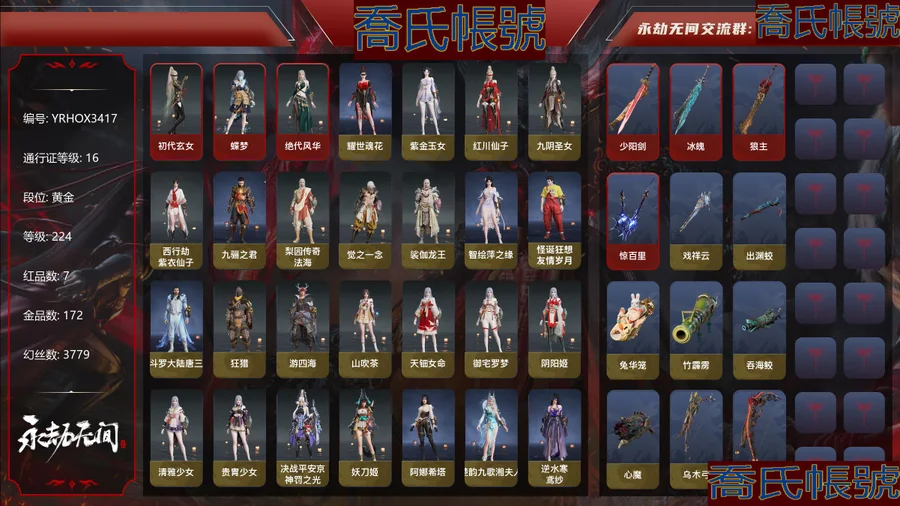 【YJYRHOX341711】7紅172金|等級224|黃金|幻絲3779|金磚0|通行證Lv.16 紅色神品:初代玄女,蝶夢,絕代風華,少陽劍,冰魄,狼主,驚百里 角色金色皮膚:耀世魂花,紫金玉女,紅川仙子,九陰聖女,西行劫·紫衣仙子,九驪之君,梨園傳奇·法海,覺之一念,裟伽龍王,智繪·萍之緣,怪誕狂想·友情歲月,鬥羅大陸·唐三,狂獵,遊四海,山吹茶,天鈿女命,御宅羅夢,陰陽姬,清雅少女,貴胄少女,決戰平安京·神罰之光,妖刀姬,阿娜希塔,楚韻九歌·湘夫人,逆水寒·鳶紗,赤霧煙霞,掌珠仙子,常勝袍,華夏寶甲·漢光,守誓者,驍騎,封神錄·申公豹,若谷,赤丹朱湛,浣煙紗,蜃樓魅影,璨銀魔梟,街頭狂歡·不敗擂主,觀山海·秋神蓐收,護世四法·持國天王,觀山海·冬神玄冥 髮型金色皮膚:縹緲發,鬥羅大陸·海神發,逆水寒·江海發,巫師3·白狼發,木棉發,(挑染)填海發,激浪發,浩渺發,(挑染)覓封侯發,翔鸞發,(挑染)鳳姿發 武器金色皮膚:戲祥雲,出淵蛟,兔華籠,竹霹靂,吞海鮫,心魔,烏木弓,腥紅之月,陰陽師·雅矢,福祿雙至,華夏神兵·永樂寶劍,拂雪絨,龍蟠,陰陽師·魂夢殘響,斷月影,長虹,建木,凌雲志,玄鯨骨叉,擊蒼穹,白虹,護世四法·降魔,倒馬棍,橈尺刀,尋魂,華夏神兵·馬首刀,耀夜流華,夔牛槌,鎮魔杵,降魔手,地火湧,玉矩,精武,蛋仔派對·鹹魚,無救,破重雲 飾品金色皮膚:魂花耀,崑崙龍神冠,美團·團上頭了,搖清楓,觀山海·腓耳,炎流雲禪笠,甲辰龍,浪焰青藤帽,福虎帽,浮元子,暗香,安歌帽,鮫人角,雪鹿雌角,約誓盔,鳳尾皂金盔,雪絨帽,觀山海·秋金,西行劫·緊箍兒,觀山海·冬稜,安樂冠,盜墓筆記·防風帽 【代幣或期限道具請以實際驗號為準】【Steam】【國服】手遊是上一任的
