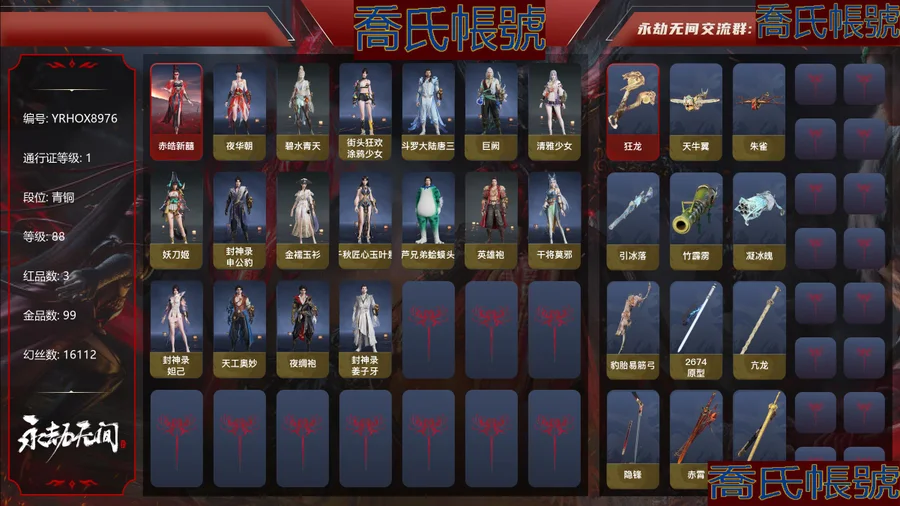 【YJYRHOX897611】3紅99金|等級88|青銅|幻絲16112|金磚432|通行證Lv.1 紅色神品:赤皓新囍,墨離,狂龍 角色金色皮膚:夜華朝,碧水青天,街頭狂歡·塗鴉少女,鬥羅大陸·唐三,巨闕,清雅少女,妖刀姬,封神錄·申公豹,金襦玉衫,千秋匠心·玉葉景,葫蘆兄弟·蛤蟆頭領,英雄袍,干將莫邪,封神錄·妲己,天工奧妙,夜綢袍,封神錄·姜子牙 髮型金色皮膚:鬥羅大陸·海神發,暖冬帽·男發,月丹發,(挑染)萬仞山發,千秋匠心·琳琅發,繾綣發,封神錄·籠煙芍藥發,(挑染)玄冥發,封神錄·仙風發 武器金色皮膚:天牛翼,朱雀,引冰落,竹霹靂,凝冰魄,豹胎易筋弓,2674·原型,亢龍,隱鋒,赤霄,含光承影,破天,雷王鋸,長虹,建木,委蛇矛,仙舞,耀夜流華,櫻落,傲骨,鎮魔杵,精武,蛋仔派對·鹹魚,怨憎,破重雲 飾品金色皮膚:雁落笠,炎流雲禪笠,甲辰龍,福虎帽,鮫人角,葫蘆兄弟·蛤蟆頭,街頭狂歡·制勝之道,封神錄·傾城,盜墓筆記·防風帽 變身器:葫蘆兄弟·三娃葫蘆,千秋匠心·兇虎 【代幣或期限道具請以實際驗號為準】【Steam】【國服】寧紅葉紅皮帽子 雙截棍紅皮 鉤鎖紅皮 斬馬紅皮差幾抽 號裡女生好友比較多