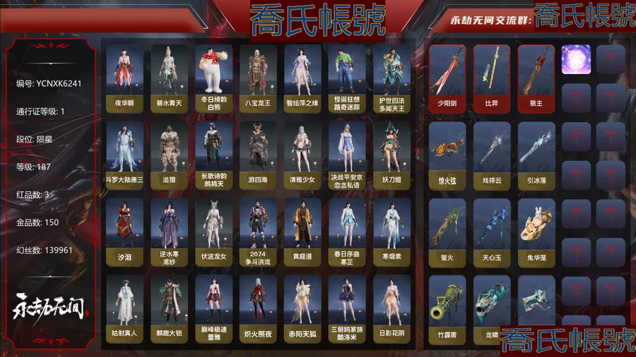 【YJYCNXK624111】3紅150金|等級187|隕星|幻絲139961|金磚52|通行證Lv.1 紅色神品:少陽劍,比羿,狼主 角色金色皮膚:夜華朝,碧水青天,冬日綺韻·白熊,八寶龍王,智繪·萍之緣,怪誕狂想·路奇迷蹤,護世四法·多聞天王,鬥羅大陸·唐三,追獵,長歌詩韻·鷓鴣天,遊四海,清雅少女,決戰平安京·戀念私語,妖刀姬,汐淚,逆水寒·鳶紗,伏波龍女,2674·爭鬥洪流,黃庭道,春日序曲·寒芷,寒煙素,姑射真人,麟鹿大鎧,巔峰極速·蕾雅,熾火照夜,赤陽天狐,三麗鷗家族·酷洛米,日影花陰,夜綢袍,長歌詩韻·念奴嬌,觀山海·文鰩,赤誠心,金財聚輝,古冢行,虹貓藍兔七俠傳·藍兔,長歌詩韻·如夢令 髮型金色皮膚:簪纓發,伏苓發,鬥羅大陸·海神發,逆水寒·江海發,月丹發,逆水寒·鳶發,(挑染)萬仞山發,(挑染)凜威發,(挑染)酷洛米·雙色捲髮發,(挑染)玄冥發,長歌詩韻·豪傑發,長歌詩韻·沉醉發 武器金色皮膚:驚火弦,戲祥雲,引冰落,螢火,天心玉,兔華籠,竹霹靂,龍嘯,丹鶴,月虹弦角,腥紅之月,翠影,詭刃八岐,2674·原型,虹貓藍兔七俠傳·長虹劍,虹貓藍兔七俠傳·冰魄劍,隱鋒,華夏神兵·永樂寶劍,壺中日月,殘陽,鎏金勺,數珠丸,燭淚,雷王鋸,斷月影,護雲狩,鎮山河,焦鈺,長虹,擊蒼穹,護世四法·降魔,2674·貳型電漿杖,仙舞,青峰疊扇,墨絨羽扇,葉底花,夔牛槌,嘶風,鎮魔杵,詭月,破重雲,光影裁決,護世四法·螭龍 飾品金色皮膚:雁落笠,委蛇朱冠,崑崙龍神冠,冬日綺韻·熊熊頭,甲辰龍,凱旋盔,華夏寶甲·歸正,華夏寶甲·漢榮,銀雪,酷洛米·甜酷髮箍,惡魔尾巴,玄天冠,虹貓藍兔七俠傳·虹光,玉蓮冠,夜露帽,神愈之冕,虹貓藍兔七俠傳·寒月,虹貓藍兔七俠傳·落花,虹貓藍兔七俠傳·雪團 【代幣或期限道具請以實際驗號為準】【Steam】【國服】