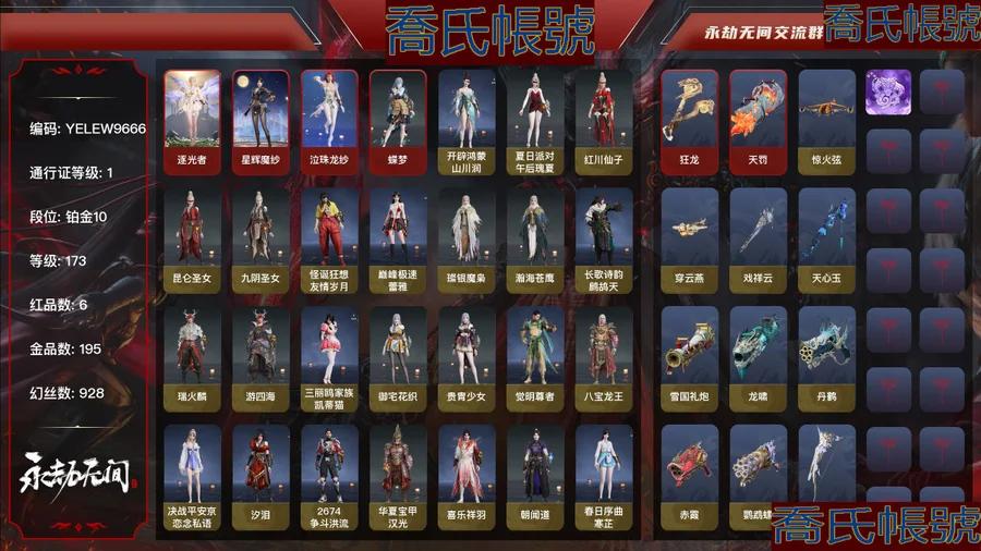 【OBYELEW966642】6紅195金丨等級173丨鉑金1丨金磚44丨幻絲928丨通行證未升級Lv.1丨紅色神品:逐光者,星輝魔紗,狂龍,泣珠龍紗,蝶夢,天罰,變身器:凱蒂貓·魔杖,角色金色皮膚:開闢鴻蒙·山川潤,夏日派對·午後瑰夏,紅川仙子,崑崙聖女,九陰聖女,怪誕狂想·友情歲月,巔峰極速·蕾雅,璨銀魔梟,瀚海蒼鷹,長歌詩韻·鷓鴣天,瑞火麟,遊四海,三麗鷗家族·凱蒂貓,御宅花織,貴胄少女,覺明尊者,八寶龍王,決戰平安京·戀念私語,汐淚,2674·爭鬥洪流,華夏寶甲·漢光,喜樂祥羽,朝聞道,春日序曲·寒芷,祿運玉霄,禍津素盞,花之傾奇,白族·雲雪染,鑄神·天祿瑞光,新倩女幽魂·瑤光沐月,絕倫袍,福瑞天澤,熾火照夜,喜緣紅線,春日序曲·赤羽,長歌詩韻·念奴嬌,壽竹雲春,逆水寒·極夜天曦,古冢行,雪鈴綺歌,長歌詩韻·如夢令,染紅紗,崑崙龍神冠,紅絨暖·女,美團·團上頭了,紅絨暖·男,狼耳,福虎帽,凱蒂貓·蕾絲髮箍,狐靈面,淅蝶,白族·風花雪月,魔燭帽,鑄神·靈瑞尾,希希,虎絨耳,西行劫·緊箍兒,毛氈笠,絨喜狐耳,烏金帶,玉蓮冠,金瑛冠,鹿鈴角,神愈之冕,虹貓藍兔七俠傳·寒月,髮型金色皮膚:(挑染)騰煙發,逆水寒·江海發,碎浪發,(挑染)凜威發,鑄神·降香發,秀逸發,逆水寒·極夜發,長歌詩韻·豪傑發,蜜語發,(挑染)牽雲霞發,長歌詩韻·沉醉發,武器金色皮膚:驚火弦,穿雲燕,戲祥雲,天心玉,雪國禮炮,龍嘯,丹鶴,赤霞,鸚鵡螺,月虹弦角,腥紅之月,財神劍,琴心,赤霄,華夏神兵·永樂寶劍,殘陽,毅魂守,數珠丸,決戰平安京·夢枕,雷王鋸,決戰平安京·神罰之刃,聽濤,鎮山河,映紅鋒,長虹,建木,梅花簪,判官筆,詭月·鏈魂,破重雲,糖果棍,斷月影,銜月,青峰疊扇,墨絨羽扇,拳皇·舞扇,騰雲歌,紗彩陽傘,雷厲,幸運撲克,翠影,, 【Steam】【國服】