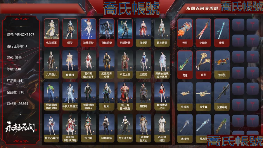 【OBYRHOX750742】11紅318金|等級238|黃金|幻絲26864|金磚15|通行證Lv.3 紅色神品:化生明王,蝶夢,墨離,泣珠龍紗,夜魅遊瑩,執明神君,天罰,少陽劍,帝星,龍雀,狂龍 角色金色皮膚:夜華朝,碧水青天,九陰聖女,秋藏桂,西行劫·紫衣仙子,武道無窮·少林,八寶龍王,蘭庭月,新倩女幽魂·瑤光沐月,怪誕狂想·路奇迷蹤,鬥羅大陸·唐三,長歌詩韻·鷓鴣天,巨闕,觀山海·夏神祝融,遊四海,巔峰極速·小可,千秋匠心·青枝瓷,陰陽師·赤影妖刀姬,妖刀姬,阿娜希塔,龍之道·無拘,開闢鴻蒙·金戈止,西行劫·楊戩,龍之影·過江龍,神武,梨園傳奇·柳生,封神錄·申公豹,靈鹿巫者,朝聞道,若谷,祿運玉霄,封神錄·龍吉公主,赤丹朱湛,花之傾奇,倒反陰陽·凜冬,千秋匠心·玉葉景,浣煙紗,福瑞天澤,葫蘆兄弟·蛤蟆頭領,西行劫·悟空,代號·絲蓴,干將莫邪,護世四法·持國天王,春不斂,赤陽天狐,封神錄·妲己,護世四法·廣目天王,日影花陰,夜綢袍,長歌詩韻·念奴嬌,虹貓藍兔七俠傳·虹貓,封神錄·姜子牙,雲間影,天虹詠,雪鈴綺歌,長歌詩韻·如夢令 髮型金色皮膚:(挑染)泠川發,簪纓發,(挑染)白芷發,鬥羅大陸·海神發,逆水寒·江海發,(挑染)騰煙發,月丹發,(挑染)清威發,封神錄·紅鸞星發,排霜發,千秋匠心·琳琅發,(挑染)宵燭發,繾綣發,封神錄·籠煙芍藥發,(挑染)狐緋發,驚雀發,秀逸發,長歌詩韻·豪傑發,(挑染)玄冥發,封神錄·仙風發,虹貓藍兔七俠傳·虹發,蜜語發,長歌詩韻·沉醉發,虹貓藍兔七俠傳·藍髮,(挑染)牽雲霞發 武器金色皮膚:驚火弦,穿雲燕,天牛翼,沉默審判,戲祥雲,引冰落,螢火,雪國禮炮,雷落,丹鶴,凝冰魄,鸚鵡螺,烏木弓,豹胎易筋弓,不良人·華陽針,翠影,詭刃八岐,天狐,2674·超越型,虹貓藍兔七俠傳·長虹劍,亢龍,隱鋒,西行劫·紫金寶劍,華夏神兵·永樂寶劍,含光承影,殘陽,燭淚,塑夢鑰匙,青石猊,破天,麒麟牙,劫濤·潮,護雲狩,鎮山河,仙彩,靈木角,焦鈺,長虹,建木,委蛇矛,糖果棍,冰輝,武道無窮·封魔,判官筆,2674·獵刃,曼提柯爾之牙,華夏神兵·馬首刀,青峰疊扇,騰雲歌,耀夜流華,櫻落,夔牛槌,傲骨,玉矩,精武,朧夜狐影,蛋仔派對·鹹魚,怨憎,武道無窮·雙蝶,無救,禍忌,光影裁決,護世四法·螭龍,雙戟-不歸 飾品金色皮膚:真的抱歉,玄陶俑面·女,目瞪馬呆·女,雁落笠,染紅紗,美團·團上頭了,植物大戰殭屍2·腦子給我,粽香遠,炎流雲禪笠,玄陶俑面·男,目瞪馬呆·男,甲辰龍,福虎帽,狐靈面,飛鼠,安歌帽,雪鹿雌角,開闢鴻蒙·簪金纓,凱旋盔,青龍盔,癸卯兔,虎絨耳,葫蘆兄弟·蛤蟆頭,西行劫·緊箍兒,觀山海·冬稜,纖蝶絨輕,封神錄·傾城,夢棠,季中賽2025·瀚沙,玄天冠,虹貓藍兔七俠傳·長風,玉蓮冠,盜墓筆記·防風帽,鹿鈴角,神愈之冕,晝百合,虹貓藍兔七俠傳·寒月 變身器:珥冰,西行劫·神君印,攬九天 【代幣或期限道具請以實際驗號為準】【Steam】【國服】