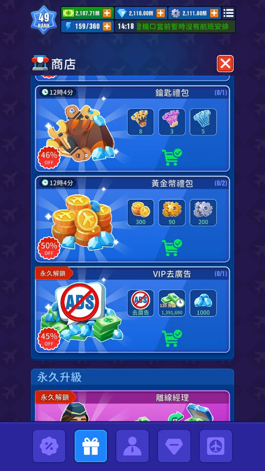 空閒機場帝國 21億鑽石/黃金幣/去廣告等全禮包/通行證/全資源 加藤超の金手指