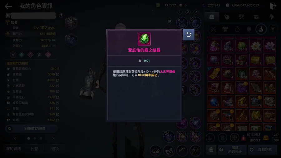 ●大量資源可讓您在遊玩過程省下不少花費(黑珍珠、突破復原券,遊戲重要物資,需求高),已處理部分突破機率!!幫您衝好全套+8以上黎明or混沌裝備 (黑色祠堂一次性弘毅火種獎勵仍在,短篇故事解完後,以目前戰力至少五十顆以上可輕鬆過關領取,製作黎明裝的材料弘毅火花/火種是目前較難購得的材料) & 全套+8以上已覺醒空虛飾品(目前全套+8空虛飾品) & +9以上空虛文物 (ps.仍留下大量資源給您繼續提升! 保留運用的彈性...建議突破復原選擇銀幣,囤突破券,否則後期得課金玩+9裝或慢慢慢慢....的存)