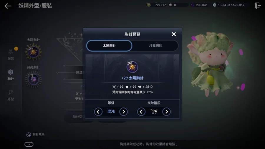 ●妖精-已解鎖 沙漠的痕跡/蛤蜊自動拾取 & 黑石塊祭壇自動奉獻 & 黑暗能量經驗值增加 等...10多種實用技能(多數等級頂),省去手動撿拾/點選 的麻煩,掛大沙漠也讓純水的效益更高些! (太陽胸針為混沌階級以上,如圖)