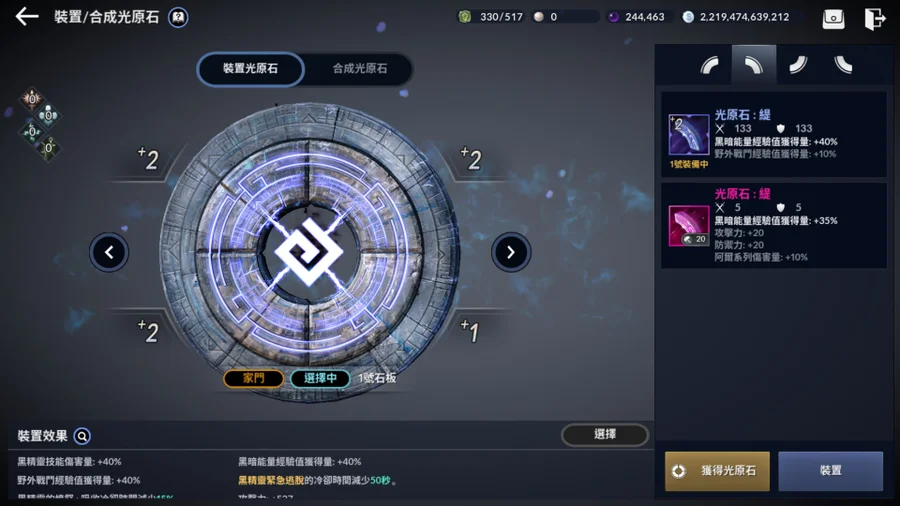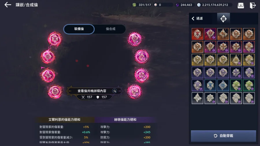 ●主角色武防裝備--- +8混沌主武器 / +8黎明輔助武器 / +8黎明頭盔 / +8黎明盔甲 / +8黎明鞋子 / +8黎明手套(全太古記憶刻印 / 全鑲滿嵌混沌水晶x30 / 全魔力刻印滿,全+100攻擊/+100防禦_頂),+8空虛項鍊(已覺醒) / +8空虛戒指(已覺醒) / +8空虛耳環(已覺醒) / +8空虛腰帶(已覺醒) / +8空虛手鐲(已覺醒)(全太古記憶刻印 / 全鑲滿精緻的混沌水晶x15 / 各部位飾品之魔力刻印_全+90以上攻擊/+90以上防禦),黑精靈倫(8個以上太古黑精靈倫, +11武力之倫 / +9鐵甲之倫 / 能量之倫 / +6經驗之倫 / +2戰爭之倫 / 意志之倫 / 阿爾之倫 / +6同行之倫 ,套用第15個倫共鳴_頂),+24協調的煉金石(鑲嵌+10混沌煉金石:突破 & +10混沌煉金石:幸運 & +9混沌煉金石:激烈 & +9混沌煉金石:勇猛,仍保留大量資源給您自由彈性選擇要衝的煉金石),+10空虛拉夫利普文物 & +10空虛阿爾文物(全太古以上紋樣,其中鑲嵌1張太古紋樣刻印書 & 3張燦爛太古紋樣刻印書_頂數值+93攻/+47防 & 1張燦爛的混沌紋樣刻印書_頂數值+133攻/+71防 & 5張混沌紋樣刻印書 ; 系列突破分別為+5/+5),+24空虛的徽章,光源石 (全混沌光源石,四種分別突破數值如圖所示;+14太古光源石=+0混沌光源石;+15太古光源石=+2混沌光源石;+16太古光源石=+4混沌光源石;製作介面可察看轉換,+15以上光源石才建議太古升為混沌,因可開箱取得),+2傳承之環 (混沌等級),+2渾沌的龜裂圖騰 (結合1個+8圖騰、2個+7圖騰),+8夜幕靈魂石/+5月光靈魂石(近期更新的新裝備機制)