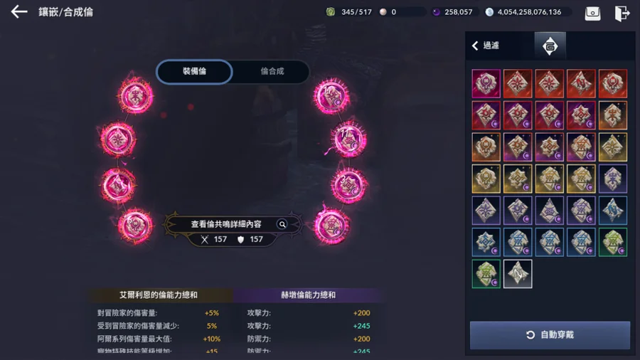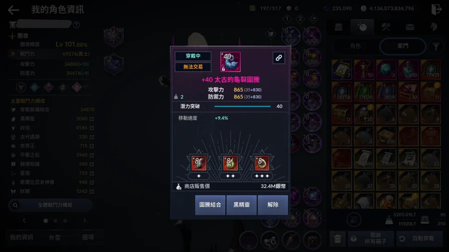 ●主角色武防裝備--- +8混沌主武器 / +9黎明輔助武器 / +8黎明頭盔 / +8黎明盔甲 / +8黎明鞋子 / +8黎明手套(全太古記憶刻印 / 全鑲滿嵌混沌水晶x30 / 全魔力刻印滿,全+100攻擊/+100防禦_頂),+8空虛項鍊(已覺醒) / +8空虛戒指(已覺醒) / +8空虛耳環(已覺醒) / +8空虛腰帶(已覺醒) / +8空虛手鐲(已覺醒)(全太古記憶刻印 / 全鑲滿精緻的混沌水晶x15 / 各部位飾品之魔力刻印_全+90以上攻擊/+90以上防禦),黑精靈倫(8個以上太古黑精靈倫, +11武力之倫 / +11鐵甲之倫 / +3能量之倫 / 經驗之倫 / 戰爭之倫 / 意志之倫 / 阿爾之倫 / +6同行之倫 ,套用第15個倫共鳴_頂),+29協調的煉金石(鑲嵌+10混沌煉金石:突破 & +10混沌煉金石:幸運 & +8混沌煉金石:激烈 & +8混沌煉金石:勇猛,仍保留大量資源給您自由彈性選擇要衝的煉金石),+10空虛拉夫利普文物 & +9空虛阿爾文物(全太古以上紋樣,其中鑲嵌2張太古紋樣刻印書 & 2張燦爛太古紋樣刻印書 & 1張燦爛的混沌紋樣刻印書_頂數值+133攻/+71防 & 5張混沌紋樣刻印書 ; 系列突破分別為+5/+5),+25空虛的徽章,光源石 (全混沌光源石,四種分別突破數值如圖所示;+14太古光源石=+0混沌光源石;+15太古光源石=+2混沌光源石;+16太古光源石=+4混沌光源石;製作介面可察看轉換,+15以上光源石才建議太古升為混沌,因可開箱取得),+2傳承之環 (混沌等級),+5渾沌的龜裂圖騰 (結合3個+8圖騰),+8夜幕靈魂石/+4月光靈魂石(近期更新的新裝備機制)