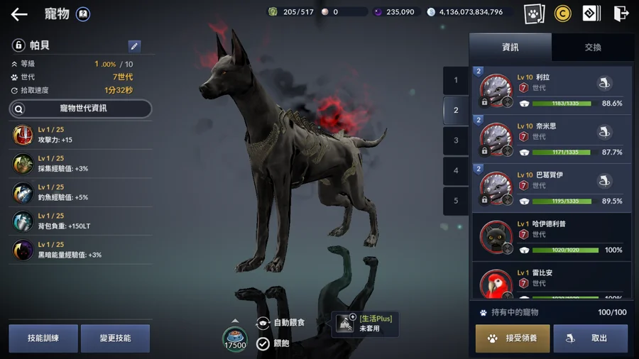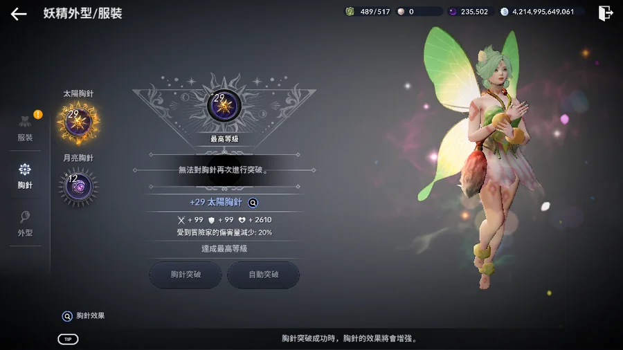 ●妖精-已解鎖 沙漠的痕跡/蛤蜊自動拾取 & 黑石塊祭壇自動奉獻 & 黑暗能量經驗值增加 等...10多種實用技能(多數等級頂),省去手動撿拾/點選 的麻煩,掛大沙漠也讓純水的效益更高些! (太陽胸針為混沌階級以上,如圖)