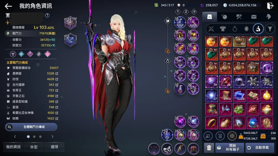 ●此號有 25萬以上黑珍珠(可買100件以上時裝的概念 哈!還在左右為難猶豫買哪件時裝嗎?!不用~ 你可以跟老闆說這些通通包起來~// 有工會的情況下消耗黑珍珠可得里程點數開啟里程任務,全公會成員可接,獎勵多! 犒賞公會員工 功用+1// 主要貨幣之一,可轉換成大量&各式需要的資源供大幅提升戰力~) / 4兆以上銀幣 (浮動,此處為準) / 450萬張以上突破復原券 (海量/ 重要物資、關鍵道具! 需求大,後期主要缺的資源之一~ 利於之後突破+9裝_建議採用不降階的突破新機制,復原券量不夠多的話,很難升+9裝 ) / 400個以上深淵文物相關資源 (海量,突破400次以上概念) / 海量煉金石資源 ( 海量,6000個以上煉金石相關道具+2000萬個以上卡普拉斯痕跡=煉金石可突破4000次以上概念) / 380個以上特別委託大型箱子 (可換多種道具,如以不易取得的匠人的毛線來說可換得960個以上,背包另有傳說服裝套飾箱子x10以上,可供深淵服裝提升戰力) / 20萬個以上圖騰箱子 / 22萬以上阿爾耶利碎片(可轉成大量次元碎片) / 5.7萬個以上克羅恩石 (製作水晶材料) / 受庇佑的光/霧之結晶選擇箱子x4 (100%機率精靈倫突破材料,之前活動獎勵,留著後面使用效益高) / 10萬個以上高純度結晶 / 戰鬥PLUSx90天以上(未使用/無限時) / ....還有其他資源、道具等著您探索~資源可轉化為戰力,加快戰力提升、好升級!非短期速成帳號,累積一年多重要道具&資源! 賣一隻少一隻~ 數量有限售完為止...