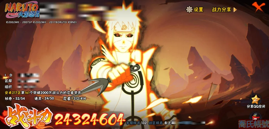 【OBHJPNG946442】戰鬥力:2432W+;段位:中忍2階;本服排名:132;戰區排名:未上榜;VIP13級;S忍51個;A忍52個;通靈獸24個;S忍:大蛇丸(5星),綱手(4星),猿飛日斬(4星),須佐能乎宇智波鼬(4星),天道佩恩(4星),暴怒第六尾漩渦鳴人,九喇嘛連結漩渦鳴人,永恆萬花筒宇智波佐助,忍界大戰春野櫻,須佐能乎旗木卡卡西,自來也,仙人模式自來也,舞之豪傑自來也,傳說中的三忍自來也,百豪綱手,死門邁特凱,波風水門,九喇嘛連結波風水門,穢土轉生波風水門,穢土轉生猿飛日斬,千手扉間,穢土轉生千手扉間,千手柱間,木葉創立千手柱間,穢土轉生千手柱間,穢土轉生宇智波斑,宇智波斑,木葉創立宇智波斑,穢土轉生解宇智波斑,穢土轉生宇智波鼬,須佐能乎宇智波止水,神秘面具男,白面具宇智波斑,忍界大戰宇智波帶土,紅夜之刃神秘面具男,四代目風影羅砂,初代目風影烈鬥,二代目水影鬼燈幻月,四代目雷影艾,忍界大戰艾,三代目雷影艾,三代目土影大野木,二代目土影無,穢土轉生半藏,忍界大戰大野木,超佩恩天道,穢土轉生長門,仙人模式藥師兜,最終章大筒木舍人,大筒木桃式,大筒木金式;A忍:猿飛阿斯瑪(5星),蠍(5星),幹柿鬼鮫(5星),疾風傳我愛羅(4星),飛段(4星),宇智波鼬(3星),死司憑血飛段(3星),仙人模式漩渦鳴人,九尾查克拉漩渦鳴人,萬花筒寫輪眼宇智波佐助,須佐能乎宇智波佐助,宇智波泉奈,百豪春野櫻,忍界大戰秋道丁次,忍界大戰日向寧次,忍界大戰李洛克,幻之真容旗木卡卡西,萬花筒寫輪眼旗木卡卡西,穢土轉生猿飛阿斯瑪,七夕限定猿飛阿斯瑪,地陸,宇智波止水,火影繼承人猿飛日斬,青年波風水門,忍界大戰我愛羅,近松十人衛千代,五代目水影照美冥,桃地再不斬,穢土轉生桃地再不斬,忍界大戰奇拉比,奇拉比,青年艾,半蛇斗篷藥師兜,不緣,青年長門,漂泊浪客佩恩六道,小南,漂泊浪客小南,角都,地怨虞角都,穢土轉生角都,曉大蛇丸,緋流琥蠍,迪達拉,穢土轉生迪達拉,加藤斷,羈絆神農,猿飛木葉丸,桃式顯現漩渦博人,六代目水影長十郎,五代目雷影達魯伊,四代目土影黑土;通靈獸:忍犬,藍蛇,蛤蟆吉,忍龜,鐮鼬,猿魔,山椒魚,蜃,蛤蟆仙人,鮫鯊,蛤蟆健,烏鴉,蛞蝓,砂之守鶴,蛤蟆龍,怒鬼,怒鬼無臂,蛤蟆廣,夢貘,怒鬼爪,鷹,蜘蛛,辛牙;時裝:狂野鮫鯊幹柿鬼鮫,百戰佩恩天道,百戰宇智波鼬須佐能乎,蜀面豪傑舞之豪傑自來也,百戰大蛇丸,百戰波風水門,太極靈韻日向花火武當宗師,智勇記者宇智波佐良娜,驚雷掠影達魯伊五代目雷影,傳說的光芒波風水門,飛瀑流泉長十郎六代目水影,熊貓少女天天峨眉宗師,剎那的藝術迪達拉,驕陽翠羽照美冥夏日泳裝,菁英忍者旗木卡卡西少年,風之守護我愛羅忍界大戰,可愛睡衣漩渦鳴人,土之固守大野木三代目土影,編織虛實宇智波鼬,緋櫻綻放春野櫻百豪,龍的傳人李洛克截拳宗師,睿勇新星千手扉間少年,命定之戰宇智波佐助疾風傳,純白之心白,血霧怪人幹柿鬼鮫,烈土霓裳黑土四代目土影;【217】鴻蒙217區-51s-2435w-v13