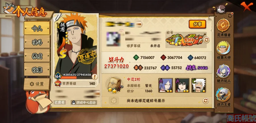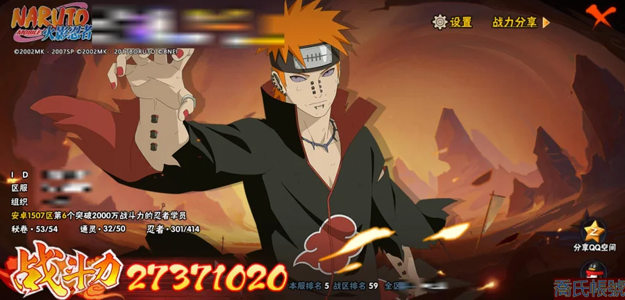 【OBHLLXQ714542】戰鬥力:2737W+;段位:中忍2階;本服排名:5;戰區排名:59;VIP14級;S忍48個;A忍57個;通靈獸32個;S忍:仙人模式自來也(5星),綱手(5星),猿飛日斬(5星),大蛇丸(4星),須佐能乎宇智波鼬(4星),初代目風影烈鬥(4星),天道佩恩(4星),暴怒第六尾漩渦鳴人,九喇嘛連結漩渦鳴人,永恆萬花筒宇智波佐助,忍界大戰春野櫻,須佐能乎旗木卡卡西,自來也,舞之豪傑自來也,傳說中的三忍自來也,百豪綱手,死門邁特凱,波風水門,穢土轉生波風水門,穢土轉生猿飛日斬,千手扉間,穢土轉生千手扉間,穢土轉生千手柱間,木葉創立千手柱間,穢土轉生宇智波斑,木葉創立宇智波斑,穢土轉生解宇智波斑,穢土轉生宇智波鼬,須佐能乎宇智波止水,神秘面具男,白面具宇智波斑,忍界大戰宇智波帶土,紅夜之刃神秘面具男,四代目風影羅砂,二代目水影鬼燈幻月,四代目雷影艾,忍界大戰艾,三代目雷影艾,穢土轉生金角銀角,三代目土影大野木,二代目土影無,穢土轉生半藏,忍界大戰大野木,超佩恩天道,仙人模式藥師兜,最終章大筒木舍人,大筒木桃式,大筒木金式;A忍:猿飛阿斯瑪(5星),疾風傳我愛羅(5星),蠍(5星),幹柿鬼鮫(5星),死司憑血飛段(5星),飛段(4星),旗木卡卡西(3星),宇智波鼬(3星),迪達拉(3星),猿飛木葉丸(3星),仙人模式漩渦鳴人,忍者之路神秘面具男,九尾查克拉漩渦鳴人,萬花筒寫輪眼宇智波佐助,須佐能乎宇智波佐助,宇智波泉奈,忍界大戰秋道丁次,忍界大戰日向寧次,忍界大戰李洛克,幻之真容旗木卡卡西,萬花筒寫輪眼旗木卡卡西,忍界大戰旗木卡卡西,宇智波止水,新春限定宇智波止水,新春限定波風水門,青年波風水門,忍界大戰我愛羅,新春限定我愛羅,近松十人衛千代,五代目水影照美冥,俠隱江湖照美冥,漂泊武士桃地再不斬,穢土轉生桃地再不斬,奇拉比,忍界大戰奇拉比,青年艾,忍界大戰土臺,漂泊武士千手扉間,半蛇斗篷藥師兜,不緣,青年長門,漂泊浪客佩恩六道,小南,漂泊浪客小南,地怨虞角都,穢土轉生角都,曉大蛇丸,緋流琥蠍,新春限定宇智波鼬,穢土轉生迪達拉,惡靈之影飛段,俠隱江湖大野木,羈絆神農,五代目雷影達魯伊,桃式顯現漩渦博人,六代目水影長十郎,四代目土影黑土;通靈獸:忍犬,藍蛇,蛤蟆吉,忍龜,鐮鼬,猿魔,山椒魚,蜃,蛞蝓,蛤蟆仙人,鮫鯊,蛤蟆健,烏鴉,熊貓,二尾又旅,蛤蟆龍,怒鬼,蛤蟆廣,,砂之守鶴,巨型三足鳥,夢貘,萬蛇,怒鬼無臂,鷹,蜘蛛,怒鬼爪,辛牙,鵺,變色龍,祥瑞金烏;時裝:百戰波風水門,百戰宇智波鼬須佐能乎,桀驁之刃猿飛阿斯瑪,鋼鐵之軀邁特凱,蜀面豪傑舞之豪傑自來也,百戰佩恩天道,狂野鮫鯊幹柿鬼鮫,百戰大蛇丸,太極靈韻日向花火武當宗師,龍吟浪客千手扉間漂泊武士,土之固守大野木三代目土影,飛瀑流泉長十郎六代目水影,烈土霓裳黑土四代目土影,火之意志綱手百豪,可愛睡衣漩渦鳴人,血霧怪人幹柿鬼鮫,風之守護我愛羅忍界大戰,傳說的光芒波風水門,剎那的藝術迪達拉,龍的傳人李洛克截拳宗師,命定之戰宇智波佐助疾風傳,菁英忍者旗木卡卡西少年,隱藏內心的面具旗木卡卡西暗部,驚雷掠影達魯伊五代目雷影,編織虛實宇智波鼬,紅月映雪宇智波鼬新春限定,智勇記者宇智波佐良娜,烈火華服宇智波止水新春限定,純白之心白,緋櫻綻放春野櫻百豪,睿勇新星千手扉間少年,熊貓少女天天峨眉宗師;【1507】48s 58a 戰區個人59組織8