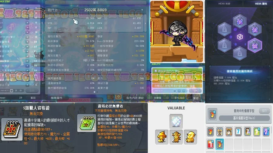4322萬屬性攻擊/3540萬戰鬥力(毀倫+小屋+公會天氣)/20B傳說內潛/UNIT字型/全滿ARC/皇家8髮6臉/欄位全開/萬聖節小屋/S獵人稱號/四王永久稱號/末日上將勳章