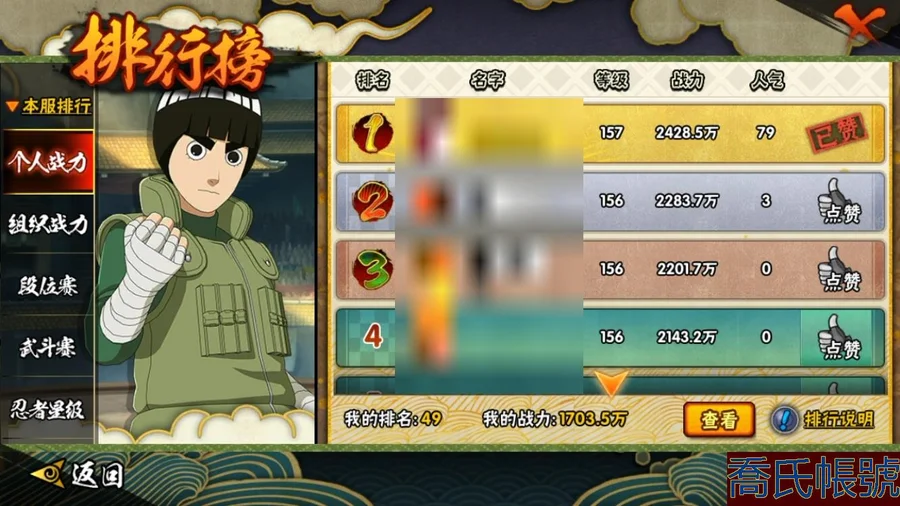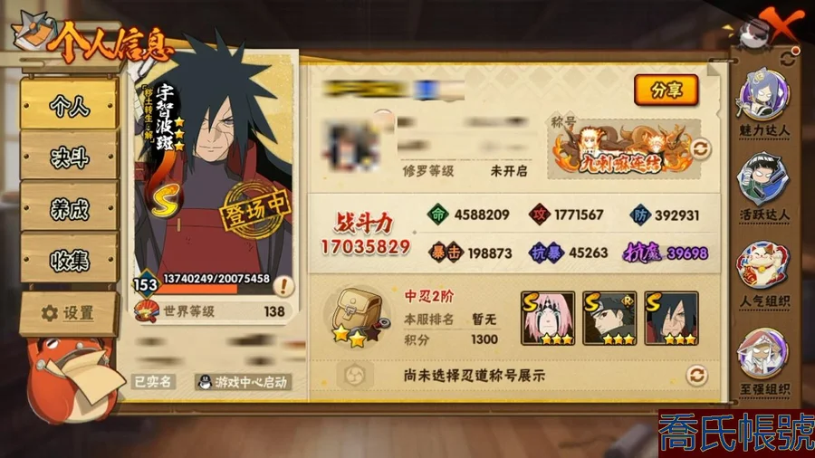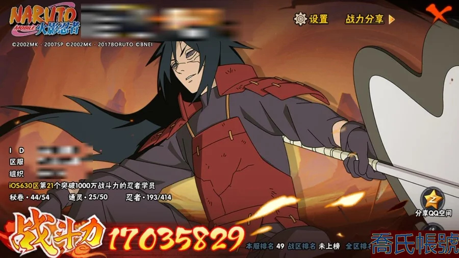 【OBHJPNG319542】戰鬥力:1703W+;段位:中忍2階;本服排名:49;戰區排名:未上榜;VIP11級;S忍31個;A忍36個;通靈獸25個;S忍:大蛇丸,綱手,天道佩恩,百豪綱手,九喇嘛連結波風水門,波風水門,忍界大戰大野木,穢土轉生長門,自來也,穢土轉生宇智波鼬,忍界大戰春野櫻,大筒木金式,穢土轉生解宇智波斑,舞之豪傑自來也,須佐能乎旗木卡卡西,仙人模式自來也,永恆萬花筒宇智波佐助,紅夜之刃神秘面具男,穢土轉生三代目風影,傳說中的三忍自來也,大筒木桃式,穢土轉生千手扉間,白面具宇智波斑,須佐能乎宇智波止水,猿飛日斬,九喇嘛連結漩渦鳴人,穢土轉生猿飛日斬,須佐能乎宇智波鼬,木葉創立千手柱間,忍界大戰艾,最終章大筒木舍人;A忍:邁特凱,猿飛阿斯瑪,蠍,幹柿鬼鮫,疾風傳我愛羅,飛段,死司憑血飛段,忍者之路神秘面具男,萬花筒寫輪眼宇智波佐助,須佐能乎宇智波佐助,宇智波泉奈,忍界大戰秋道丁次,忍界大戰日向寧次,忍界大戰李洛克,最終章日向雛田,幻之真容旗木卡卡西,宇智波止水,新春限定波風水門,近松十人衛千代,穢土轉生桃地再不斬,奇拉比,青年艾,忍界大戰土臺,漂泊武士千手扉間,不緣,青年長門,漂泊浪客佩恩六道,漂泊浪客小南,緋流琥蠍,宇智波鼬,迪達拉,俠隱江湖大野木,火之意志繼承者卑留呼,六代目水影長十郎,桃式顯現漩渦博人,四代目土影黑土;通靈獸:忍犬,藍蛇,蛤蟆吉,砂之守鶴,忍龜,鐮鼬,猿魔,熊貓,,山椒魚,蜃,蛤蟆仙人,蛞蝓,鮫鯊,蛤蟆健,烏鴉,怒鬼爪,蛤蟆龍,蛤蟆廣,怒鬼,夢貘,辛牙,鷹,怒鬼無臂,蜘蛛;時裝:狂野鮫鯊幹柿鬼鮫,百戰波風水門,百戰佩恩天道,百戰宇智波鼬須佐能乎,鋼鐵之軀邁特凱,太極靈韻日向花火武當宗師,血霧怪人幹柿鬼鮫,龍的傳人李洛克截拳宗師,睿勇新星千手扉間少年,驚雷掠影達魯伊五代目雷影,烈土霓裳黑土四代目土影,土之固守大野木三代目土影,緋櫻綻放春野櫻百豪,風之守護我愛羅忍界大戰,傳說的光芒波風水門,飛瀑流泉長十郎六代目水影,菁英忍者旗木卡卡西少年,命定之戰宇智波佐助疾風傳,熊貓少女天天峨眉宗師;【630】【蘋果QQ】