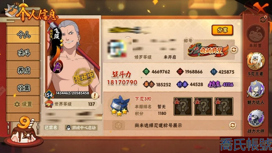 【OBHLLXQ758542】戰鬥力:1817W+;段位:下忍3階;本服排名:43;戰區排名:未上榜;VIP14級;S忍42個;A忍67個;通靈獸20個;S忍:千手柱間,須佐能乎旗木卡卡西,初代目風影烈鬥,忍界大戰大野木,須佐能乎宇智波止水,白面具宇智波斑,穢土轉生波風水門,穢土轉生宇智波斑,猿飛日斬,千手扉間,穢土轉生千手柱間,忍界大戰艾,仙人模式自來也,舞之豪傑自來也,傳說中的三忍自來也,須佐能乎宇智波鼬,二代目水影鬼燈幻月,穢土轉生解宇智波斑,最終章大筒木舍人,永恆萬花筒宇智波佐助,超佩恩天道,四代目風影羅砂,大筒木桃式,綱手,木葉創立千手柱間,忍界大戰春野櫻,百豪綱手,穢土轉生宇智波鼬,神秘面具男,木葉創立宇智波斑,忍界大戰宇智波帶土,死門邁特凱,紅夜之刃神秘面具男,自來也,穢土轉生猿飛日斬,大蛇丸,波風水門,九喇嘛連結漩渦鳴人,大筒木金式,穢土轉生千手扉間,天道佩恩,仙人模式藥師兜;A忍:猿飛阿斯瑪,蠍,幹柿鬼鮫,疾風傳我愛羅,飛段,死司憑血飛段,忍者之路神秘面具男,九尾查克拉漩渦鳴人,萬花筒寫輪眼宇智波佐助,須佐能乎宇智波佐助,疾風傳咒印宇智波佐助,宇智波泉奈,忍界大戰秋道丁次,忍界大戰日向寧次,忍界大戰李洛克,最終章日向雛田,幻之真容旗木卡卡西,旗木卡卡西,萬花筒寫輪眼旗木卡卡西,忍界大戰旗木卡卡西,驚門邁特凱,穢土轉生猿飛阿斯瑪,地陸,宇智波止水,新春限定宇智波止水,新春限定波風水門,青年波風水門,新春限定我愛羅,近松十人衛千代,五代目水影照美冥,俠隱江湖照美冥,桃地再不斬,漂泊武士桃地再不斬,穢土轉生桃地再不斬,奇拉比,青年艾,忍界大戰土臺,俠隱江湖綱手,漂泊武士千手扉間,俠隱江湖藥師兜,不風,不緣,青年長門,漂泊浪客佩恩六道,小南,夏日泳裝小南,漂泊浪客小南,絕,角都,穢土轉生角都,曉大蛇丸,緋流琥蠍,曉創生蠍,宇智波鼬,新春限定宇智波鼬,鮫肌融合幹柿鬼鮫,迪達拉,穢土轉生迪達拉,新春限定迪達拉,阿飛,曉創生飛段,暴怒宇智波帶土,漂泊浪客宇智波帶土,桃式顯現漩渦博人,六代目水影長十郎,五代目雷影達魯伊,四代目土影黑土;通靈獸:忍犬,藍蛇,蛤蟆吉,忍龜,鐮鼬,猿魔,砂之守鶴,山椒魚,蜃,熊貓,蛤蟆仙人,蛞蝓,鮫鯊,蛤蟆健,烏鴉,蛤蟆龍,蛤蟆廣,夢貘,鷹,蜘蛛;時裝:百戰大蛇丸,百戰波風水門,百戰佩恩天道,百戰宇智波鼬須佐能乎,太極靈韻日向花火武當宗師,滄瀾狂侍佩恩·六道漂泊浪客,晨昏神使小南漂泊浪客,冷玉豪情綱手俠隱江湖,剎寂鬼人桃地再不斬漂泊武士,龍吟浪客千手扉間漂泊武士,龍的傳人李洛克截拳宗師,命定之戰宇智波佐助疾風傳,土之固守大野木三代目土影,血霧怪人幹柿鬼鮫,睿勇新星千手扉間少年,熊貓少女天天峨眉宗師,風之守護我愛羅忍界大戰,剎那的藝術迪達拉,智勇記者宇智波佐良娜,千雪霜華照美冥俠隱江湖,菁英忍者旗木卡卡西少年,烈土霓裳黑土四代目土影,憤怒的伊始宇智波帶土暴怒,驚雷掠影達魯伊五代目雷影,飛瀑流泉長十郎六代目水影,緋櫻綻放春野櫻百豪,傳說的光芒波風水門;【568】【蘋果QQ】