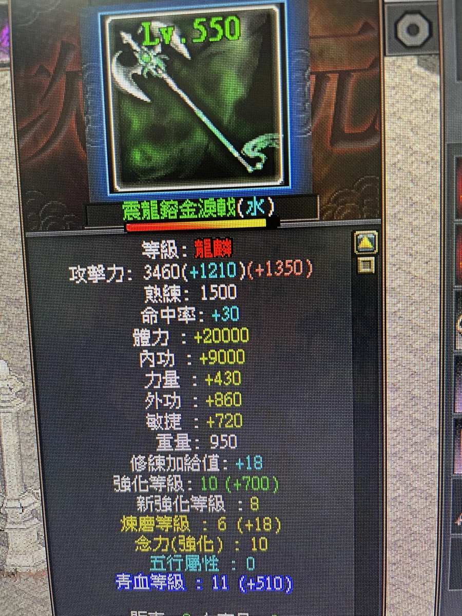 裝備 武器 要花多少銀月 天上 特球 極天 震月 龍鐵 青血進化 念力守護 精華 內功可達400萬 打聲望放黑龍整天不必吃到內 人物素質不算 專業的玩家大概知道行情 要砍價OK 奇怪的價錢就不要來問了 有其它疑問可發問QQ(斗已+14)