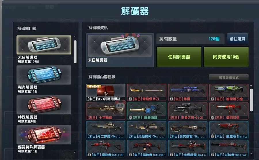 末日解碼100多個,武器盒還有11盒,出新武器可直接換免煩惱。