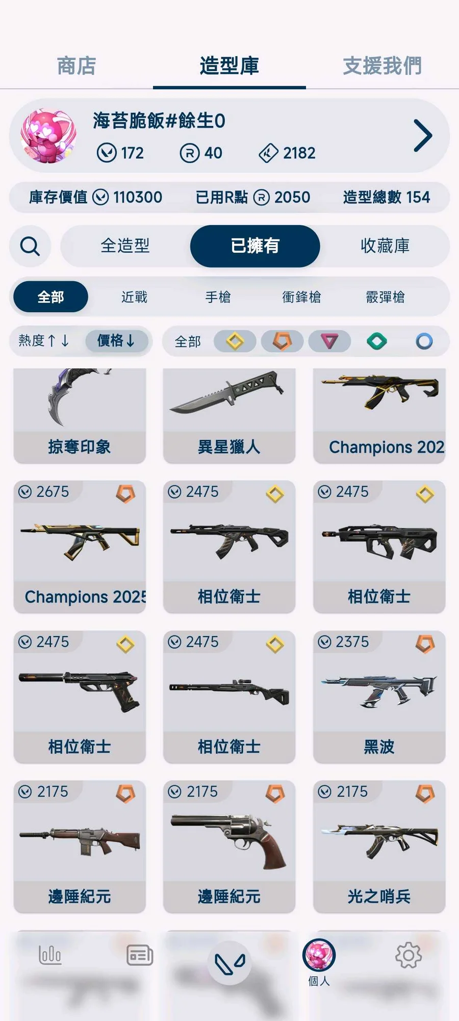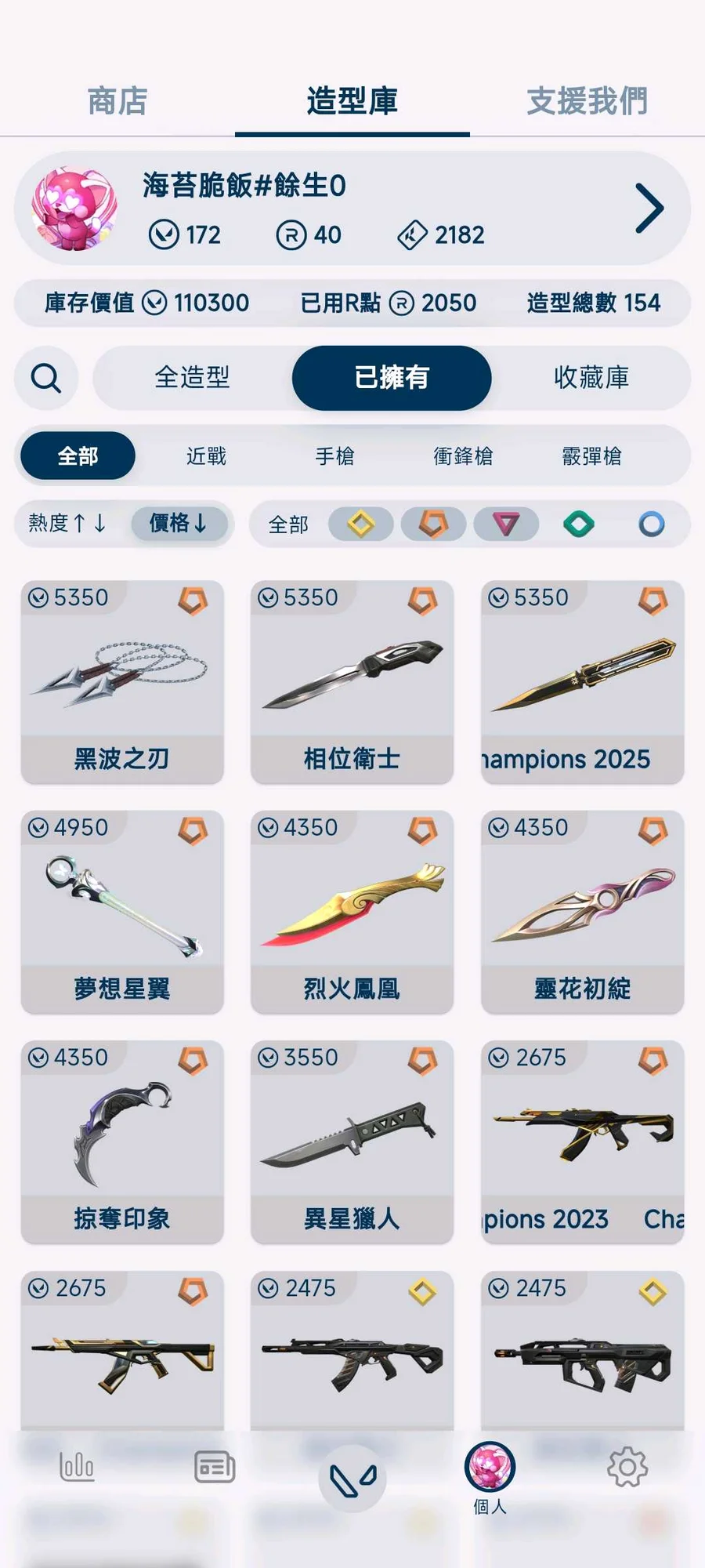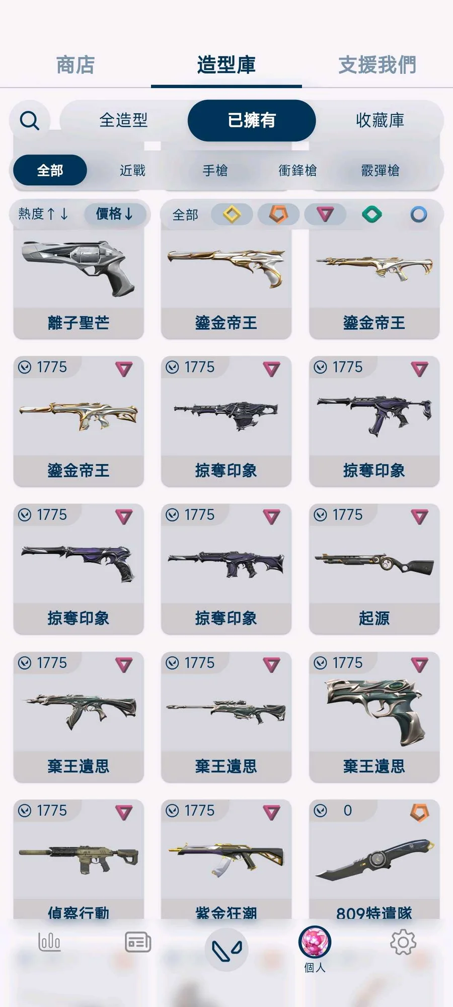 刀 小狐狸/相位衛士/鳳凰/掠奪爪刀/掠奪蝴蝶刀/異星/黑波/魔法棒/靈花苦無/25蝴蝶刀