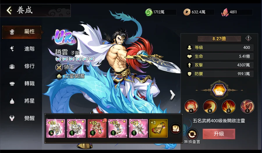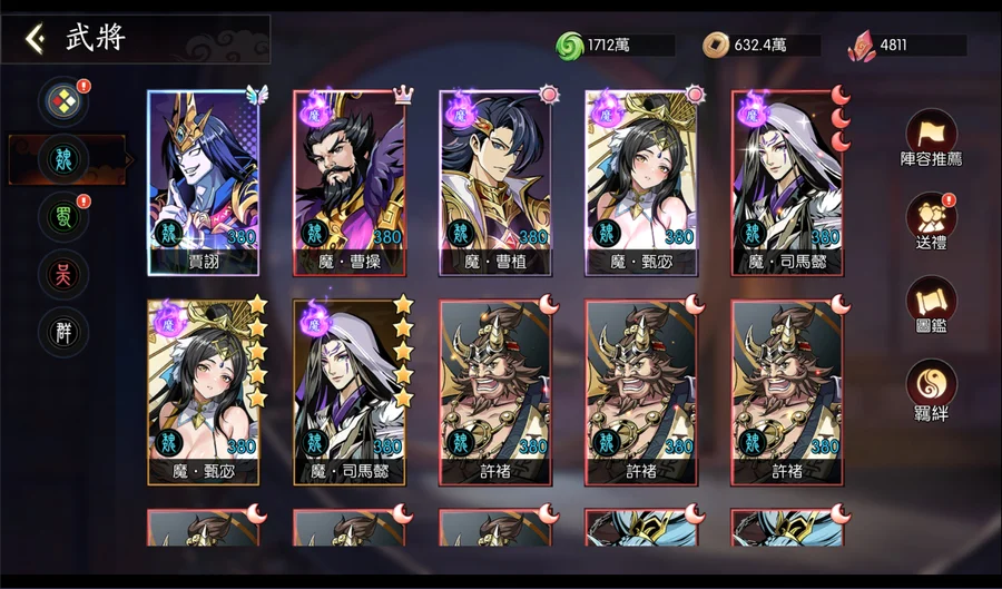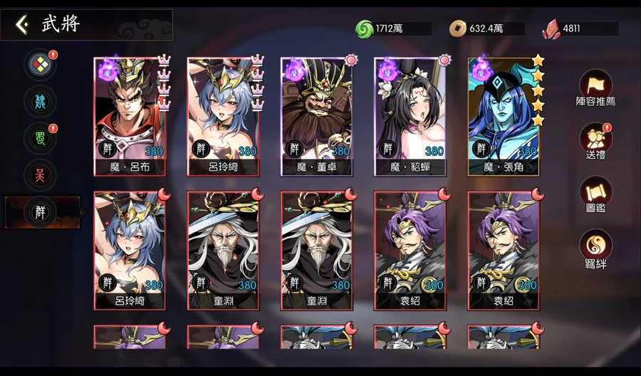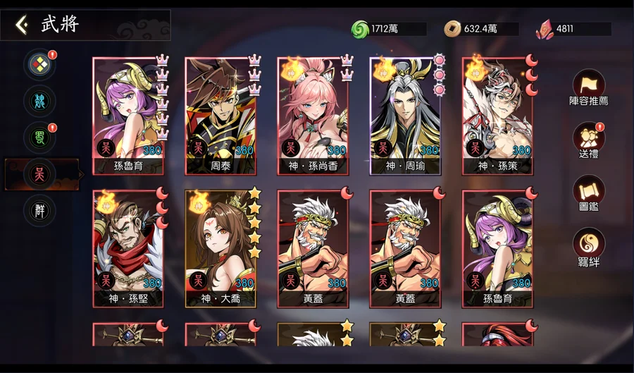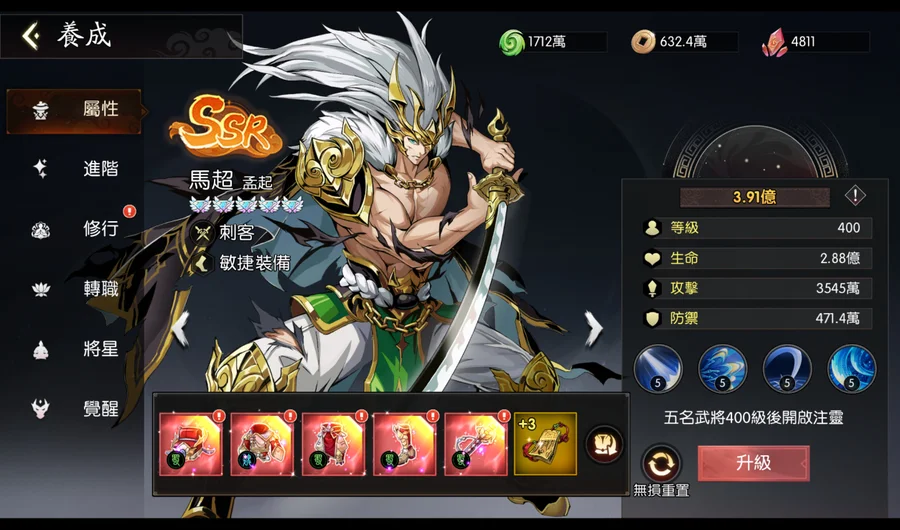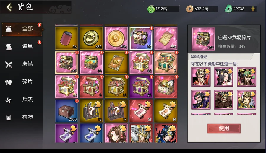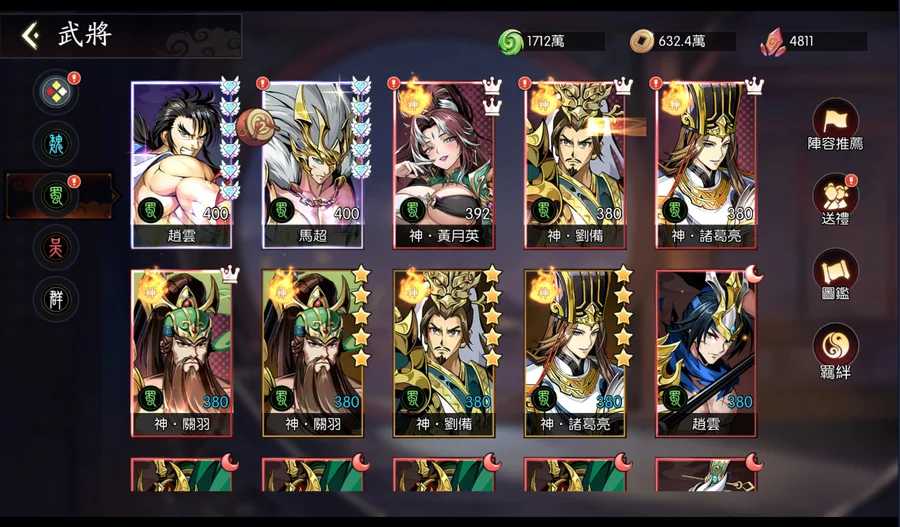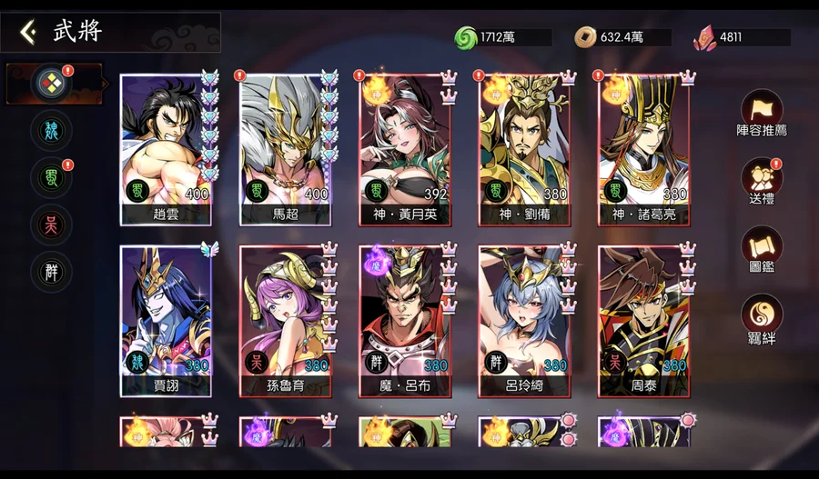 呂布目前皇冠4星半(再2隻就是5皇冠),上述9隻SP全選呂布的話,呂布可上蝴蝶。資源箱很足夠,基本上現況升級就可以直接滿級。(經驗及銅錢24小時箱各有150個以上)