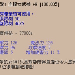 如圖本賣場為【+9滿%血腥女武神1隻】新手練功好用神寵,+9滿%亦能直接拚進化!現在下標只要﹩100 免手續費!道具皆自用已久,若確定因本道具被鎖包賠,請安心購買。「單在物在」喜歡可直接下標,並私訊確認交易時間。交易地點「卡蕾兒2s獅子城小銀後」或「飛躍廣場2s門口」。有問題歡迎「提問」或「私訊」,感謝您的下標和配合!