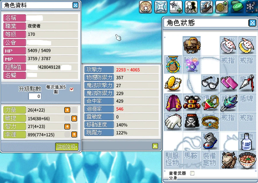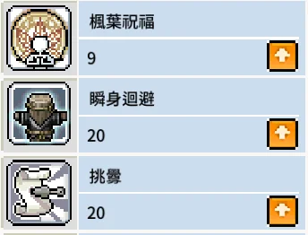 技能配點:三飛閃30、飛毒殺30、無形標30、挑釁20、楓葉祝福9、瞬身迴避30