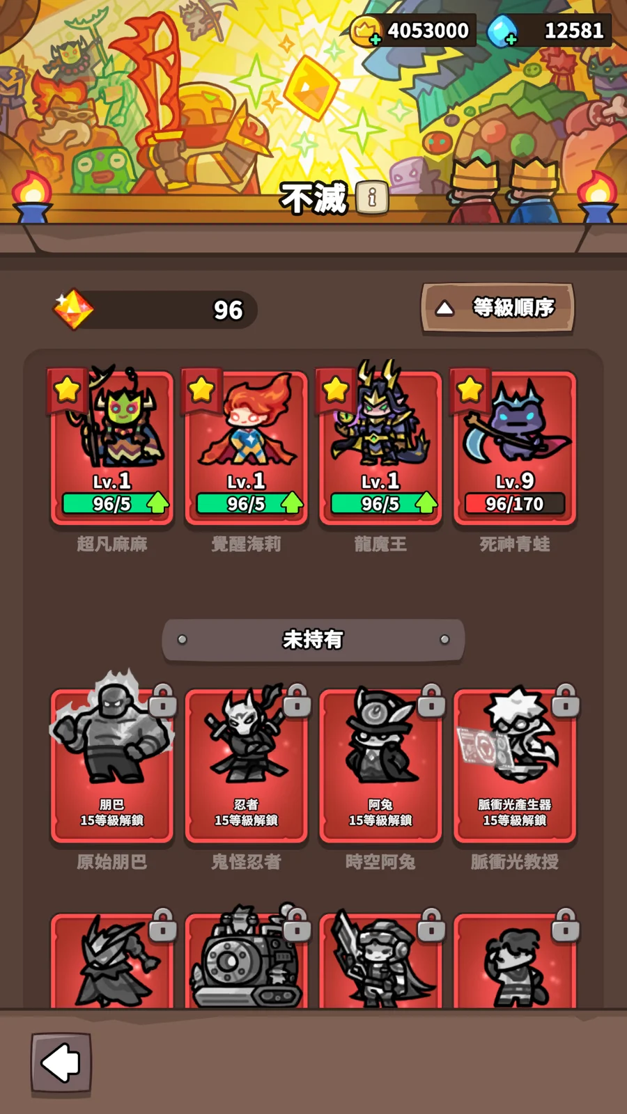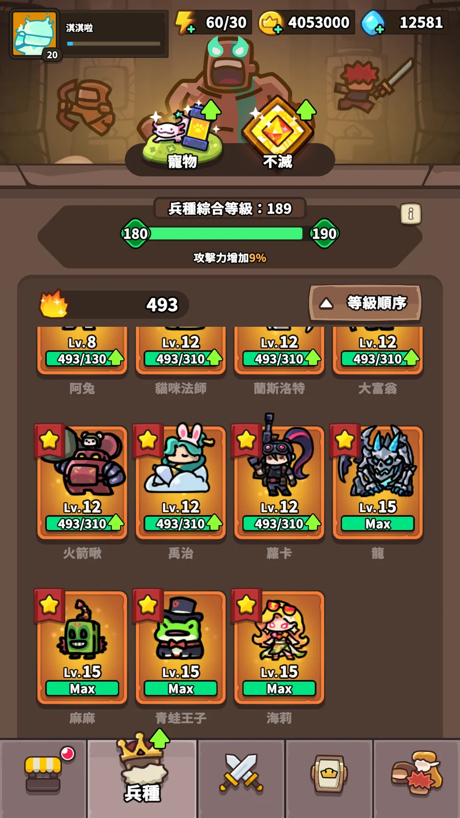 Lv.15 滿等不滅團: 青蛙王子、麻麻、海莉、蘿卡、阿兔(推圖打王主力皆頂規)。